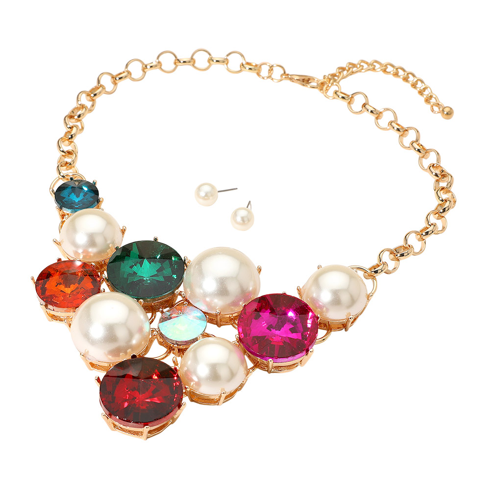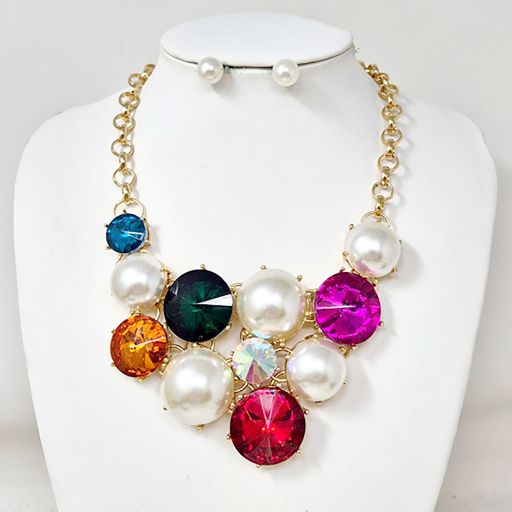 • This elegant statement necklace features lustrous pearl-like accents paired with shimmering gemstones for a radiant finish. Complete with matching stud earrings, it offers a perfect blend of sophistication and glamour, ideal for weddings, galas, or upscale evening looks.
