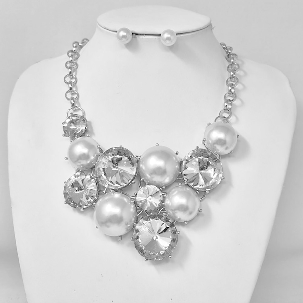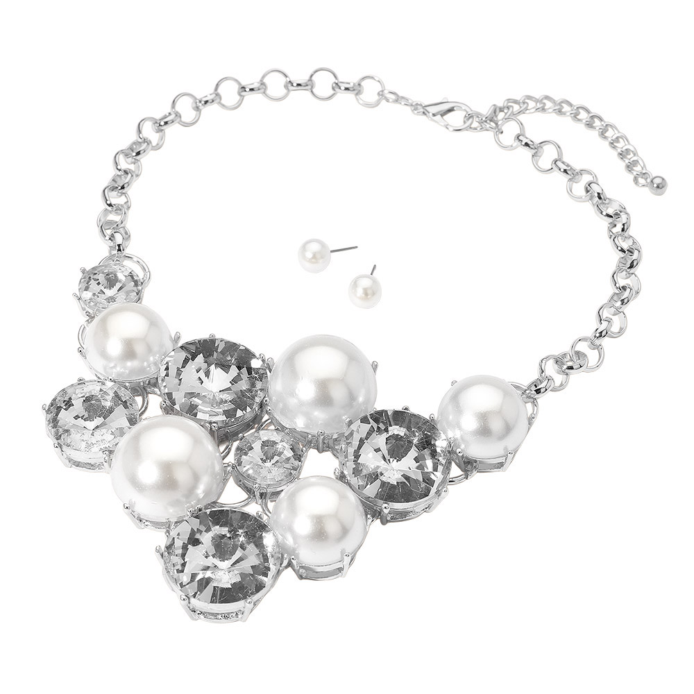 • This elegant statement necklace features lustrous pearl-like accents paired with shimmering gemstones for a radiant finish. Complete with matching stud earrings, it offers a perfect blend of sophistication and glamour, ideal for weddings, galas, or upscale evening looks.