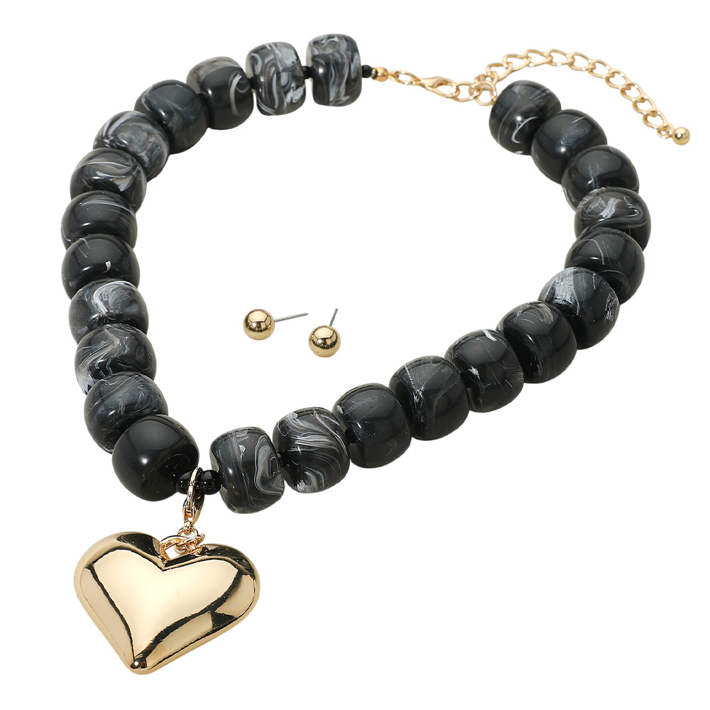 Puffy Metal Heart Pendant Chunky Beaded Statement Necklace