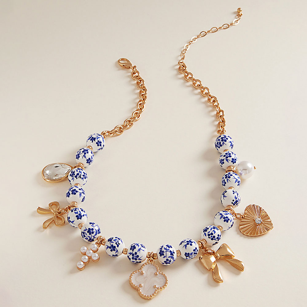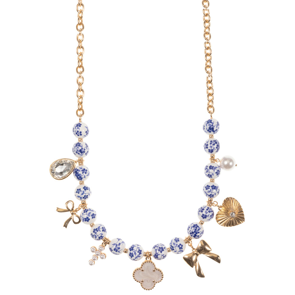 Details • Necklace Size : 17" + 3" L • Decor Size : 1.2" L • Elegant charm necklace featuring patterned beads and delicate dangling accents that create a playful yet refined statement. Designed to add personality and movement to everyday looks or special outfits, this necklace is ideal for boutiques seeking feminine, trend-forward accessories that customers can easily style for casual wear, events, or gifting occasions. • Lead and Nickel Compliant