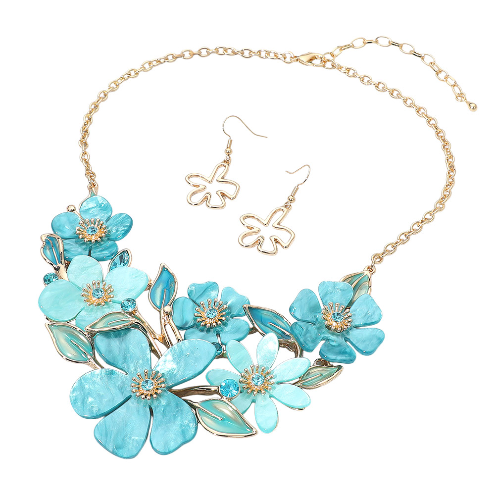 Details • Necklace Size : 18" + 3" L • Decor Size : 2.9" L • Earrings Size : 1.75" L • This floral statement necklace and earring set showcases beautifully layered petals and delicate leaf accents, creating a bold yet elegant look. Perfect for special occasions or evening events, this coordinated set adds a sophisticated, feminine charm that enhances any ensemble. • Lead and Nickel Compliant