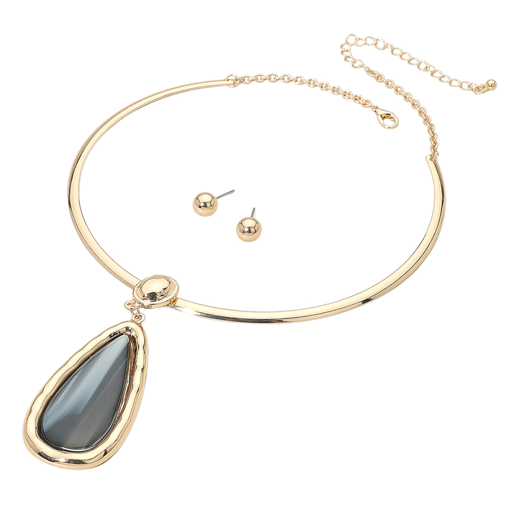 Details • Necklace Size : 16" + 3.25" L • Pendant Size : 1.2" X 3.25" • Earrings Size : 0.3" L • This teardrop pendant collar necklace and stud earring set delivers a clean, modern statement with a sleek curved collar and bold drop accent. Designed for boutique collections, it offers effortless styling for everyday wear, special occasions, gifting, and polished fashion looks. • Lead and Nickel Compliant