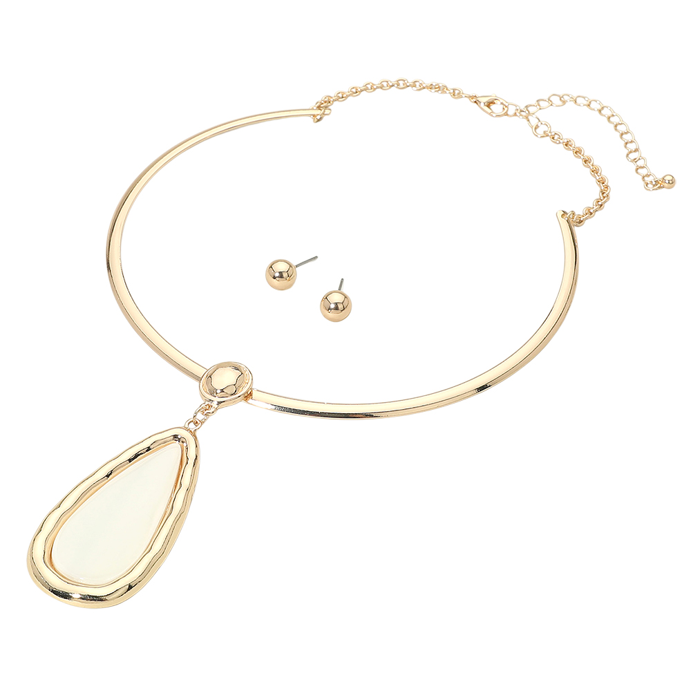 Details • Necklace Size : 16" + 3.25" L • Pendant Size : 1.2" X 3.25" • Earrings Size : 0.3" L • This teardrop pendant collar necklace and stud earring set delivers a clean, modern statement with a sleek curved collar and bold drop accent. Designed for boutique collections, it offers effortless styling for everyday wear, special occasions, gifting, and polished fashion looks. • Lead and Nickel Compliant