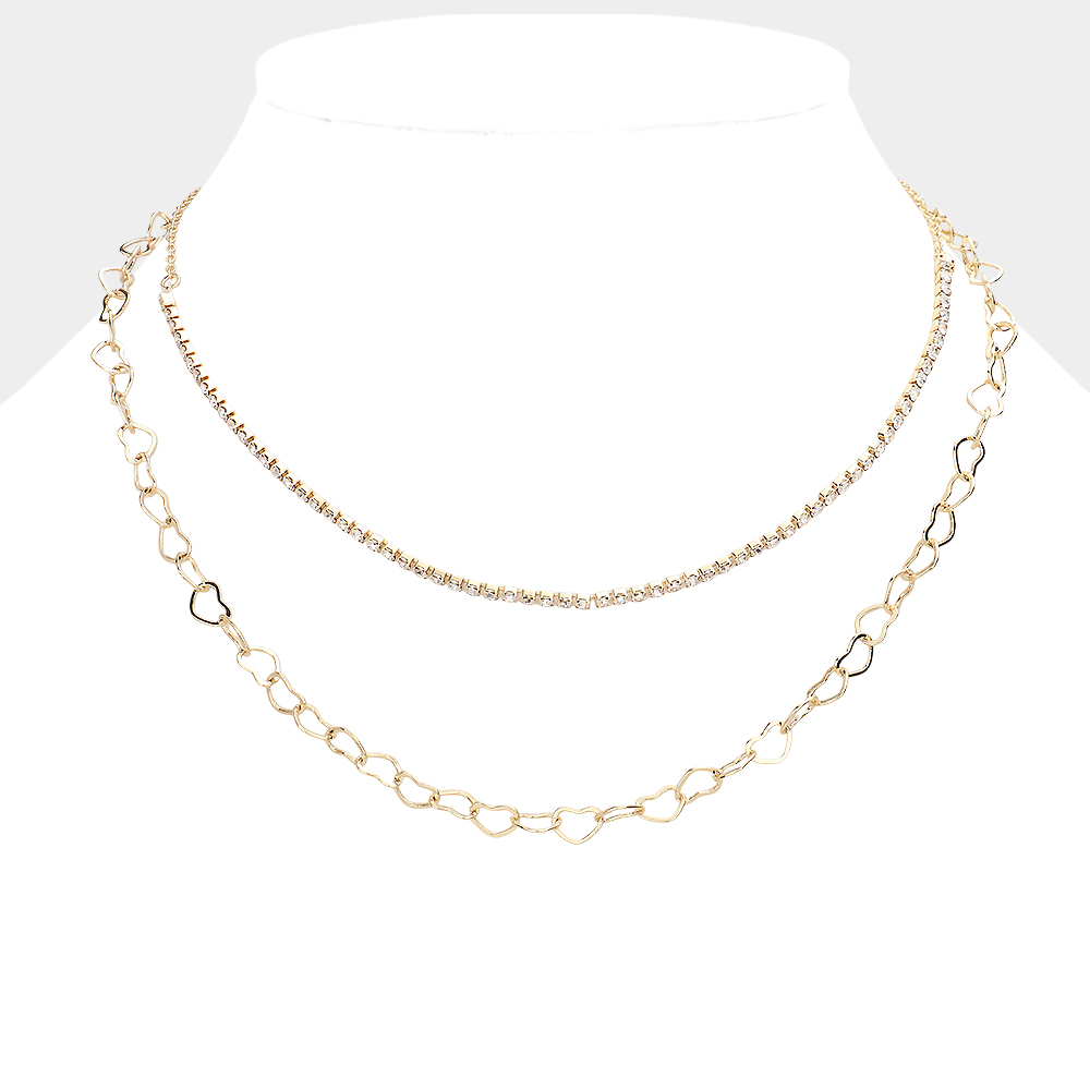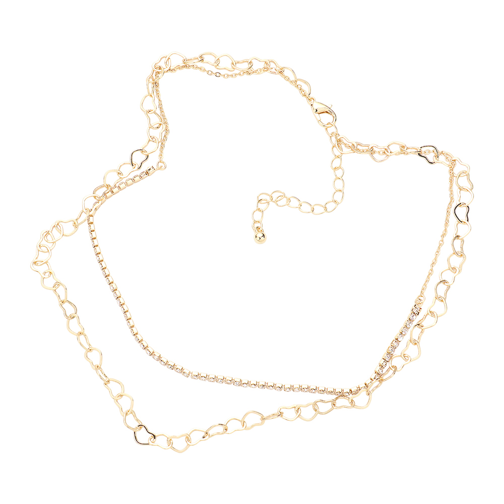 Rhinestone Metal Open Heart Link Double Layered Necklace