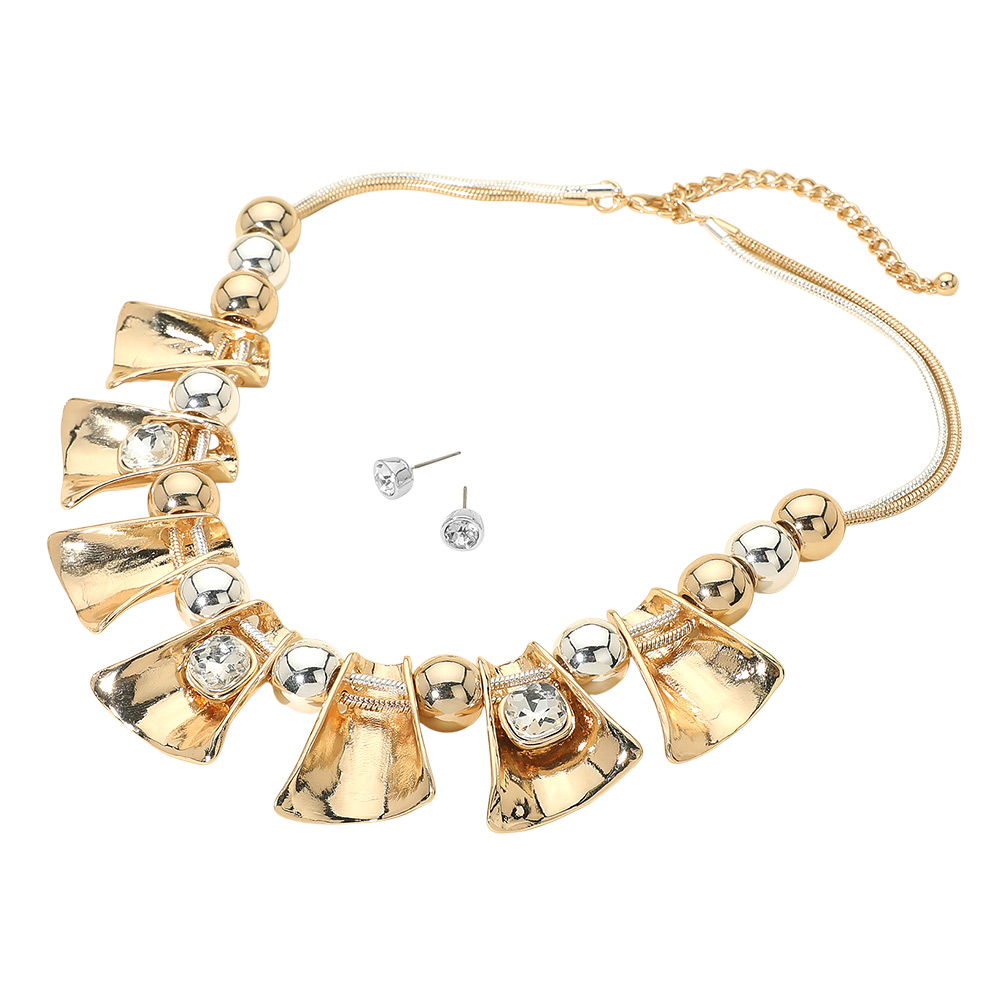 Details • Necklace Size : 18" + 3.25" L • Decor Size : 1.25" L • Earrings Size : 0.3" L • Statement necklace and stud earring set designed with bold sculpted accents, rounded bead detailing, and radiant stone highlights for a dramatic, fashion-forward look. Perfect for elevating dresses, evening wear, or special occasion outfits. A standout accessory ideal for gifting or curated boutique jewelry collections. • Lead and Nickel Compliant