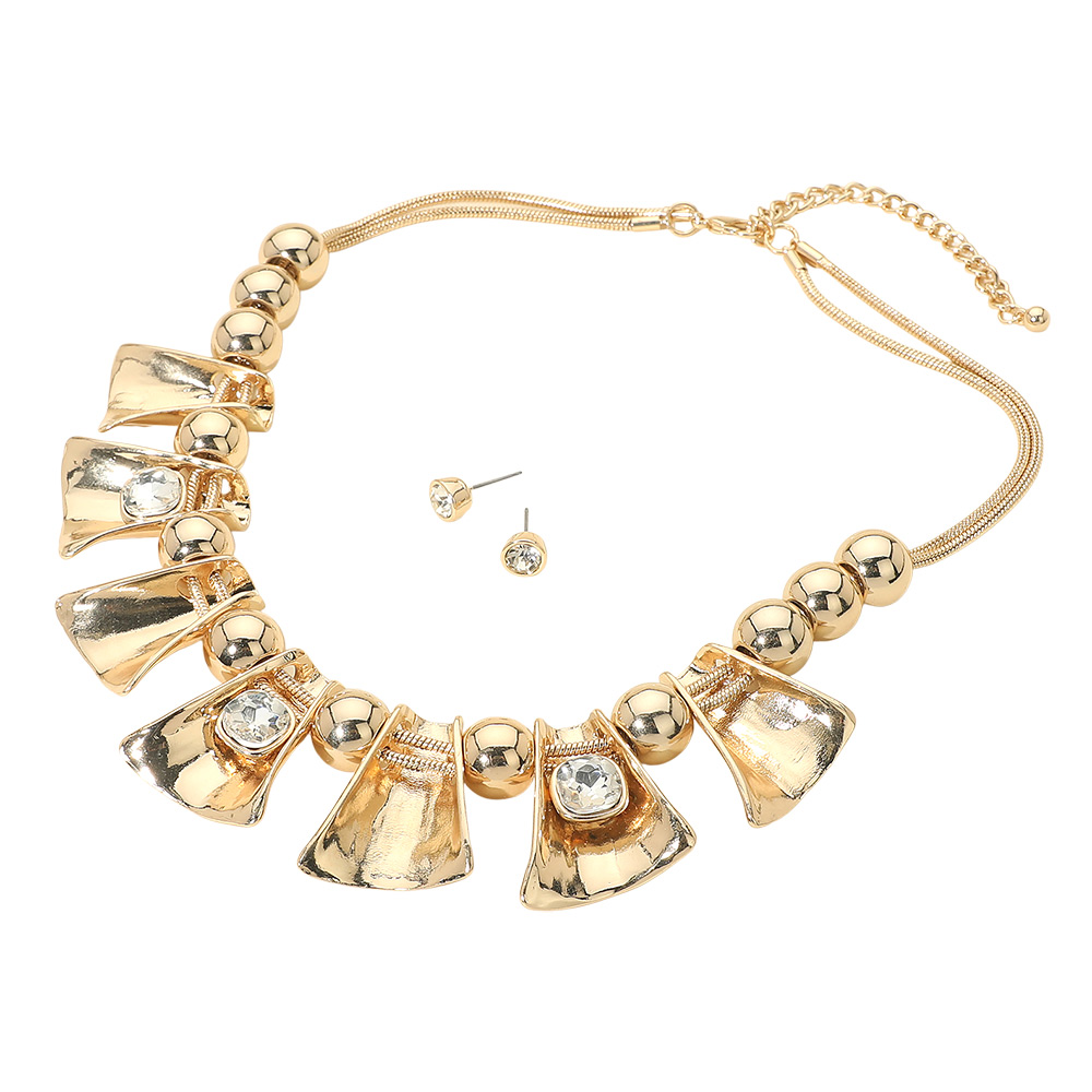 • Statement necklace and stud earring set designed with bold sculpted accents, rounded bead detailing, and radiant stone highlights for a dramatic, fashion-forward look. Perfect for elevating dresses, evening wear, or special occasion outfits. A standout accessory ideal for gifting or curated boutique jewelry collections.