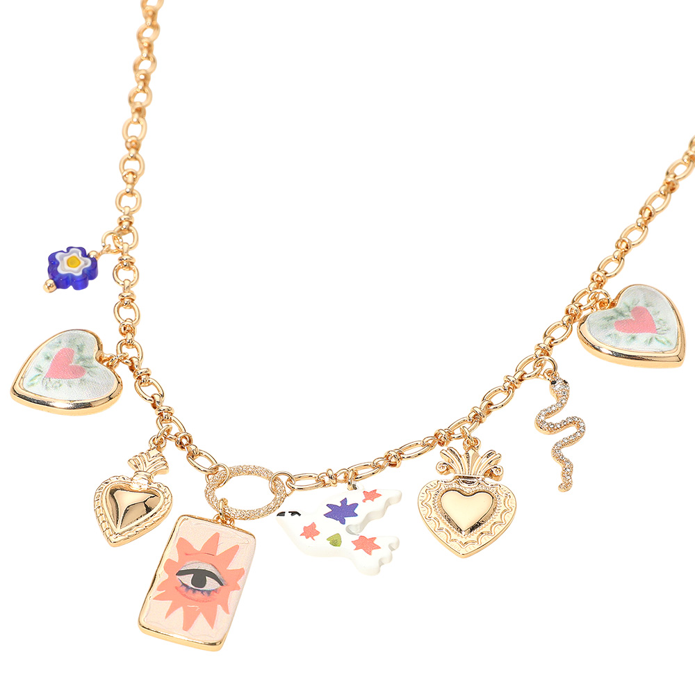Details • Necklace Size : 16.5" + 2" L • Decor Size : 1.5" L • Stylish charm necklace featuring a mix of hearts, symbolic pendants, and whimsical motifs. Designed with artistic details that express individuality and elegance, this statement necklace adds a playful yet meaningful accent to any outfit. Perfect for gifting or everyday wear. • Lead and Nickel Compliant