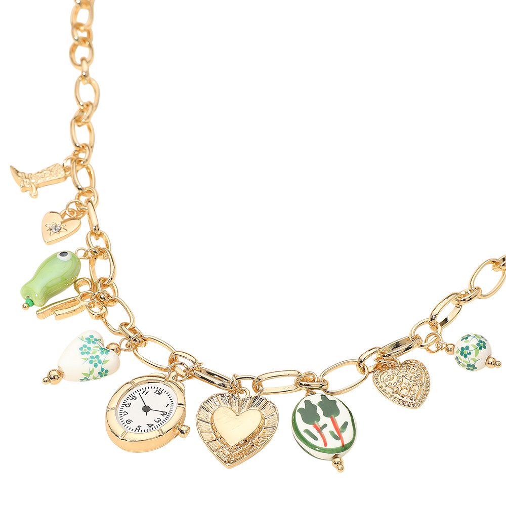 Details • Necklace Size : 16.5" + 2" L • Decor Size : 1.75" L • Trendy charm necklace adorned with heart, clock, and symbolic pendants for a playful yet elegant look. Designed with intricate details and whimsical accents, this accessory adds a touch of personality and charm to any outfit—perfect for layering or statement styling. • Lead and Nickel Compliant