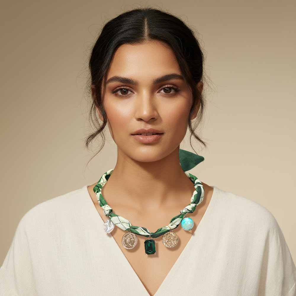 Details • Necklace Size : 28" L (Adjustable) • Decor Size : 1.1" L • Print may vary • Fashionable scarf necklace featuring a patterned fabric design adorned with assorted charms and decorative accents. A chic accessory that blends classic charm with contemporary style, perfect for enhancing both casual and dressy looks with a touch of creativity and elegance.