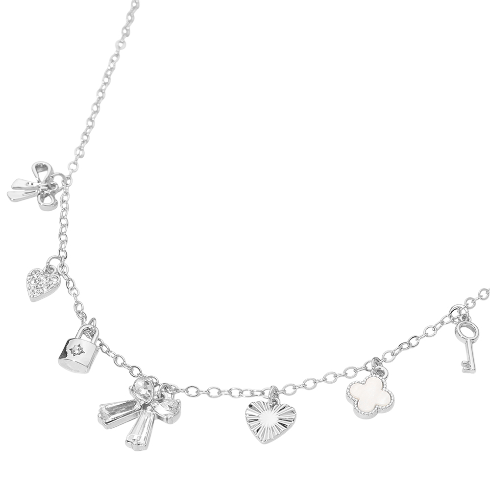 Details • Necklace Size : 16" + 3" L • Decor Size : 0.6" L • This charm necklace features a playful mix of heart, bow, key, lock, and symbolic accents arranged along a delicate chain for a stylish layered look. Designed to add personality and charm to everyday outfits, it’s perfect for boutique displays, gifting, or trend driven collections focused on romance, luck, and statement accessories. • Sterling Silver Dipped • Lead and Nickel Compliant
