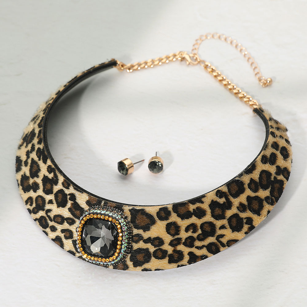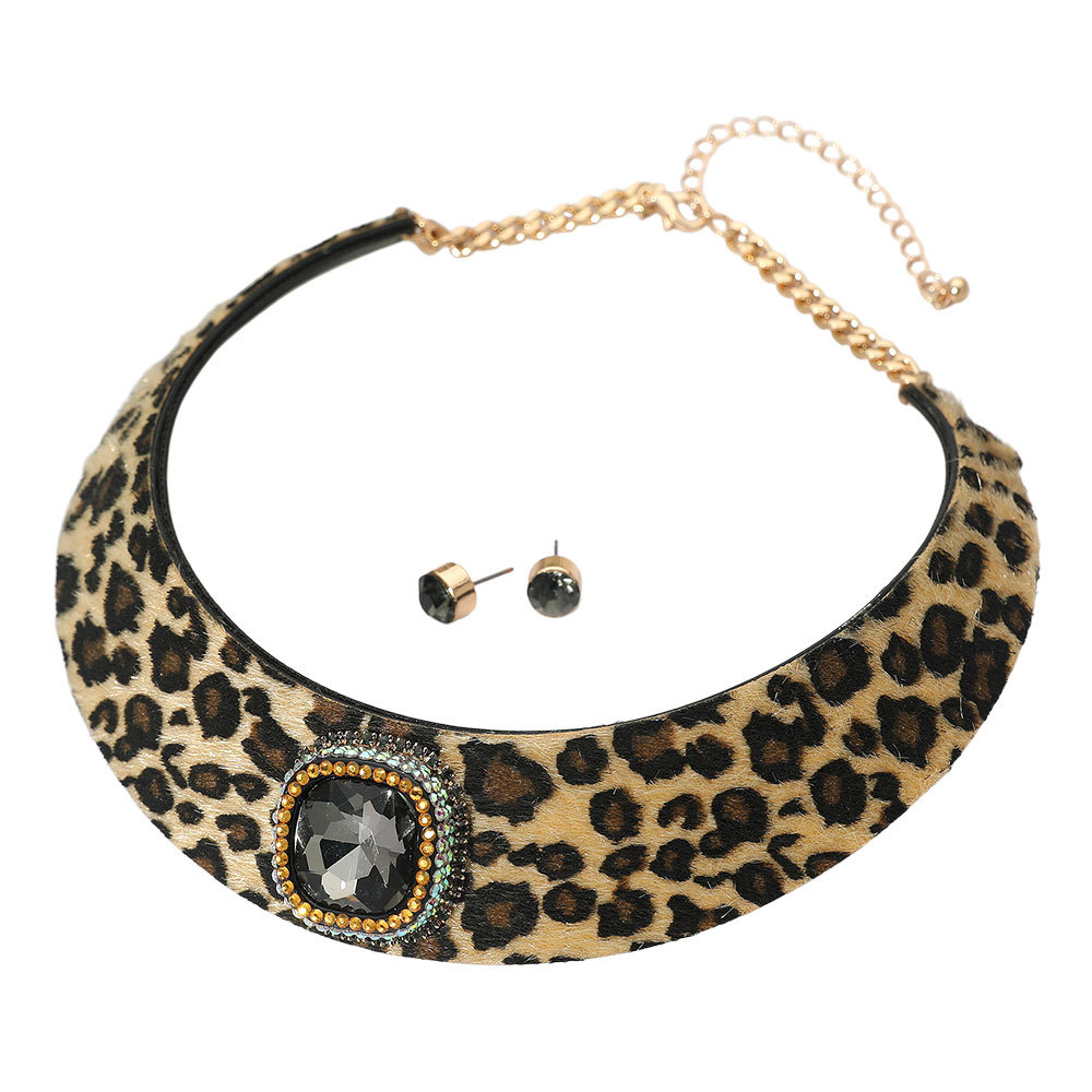 Details • Necklace Size : 16.5" + 3" L • Decor Size : 1.25" L • Earrings Size : 0.3" L • Turn heads with this bold leopard print collar necklace featuring a sparkling gemstone centerpiece accented by metallic details. Paired with matching stud earrings, it’s the perfect set for parties, special events, or adding fierce flair to your everyday outfits with a fashion-forward edge. • Lead and Nickel Compliant