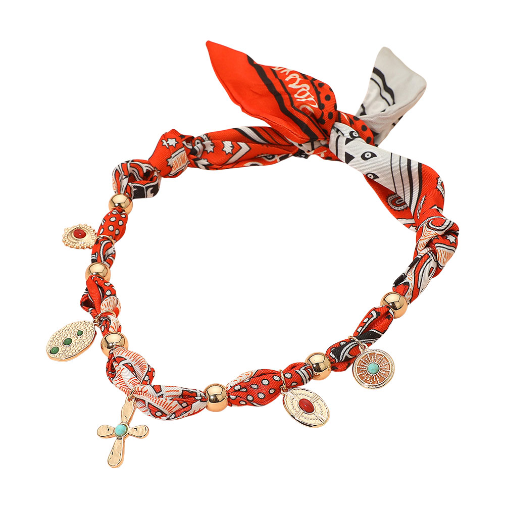 Stone Accent Boho Charm Station Fabric Scarf Adjustable Necklace