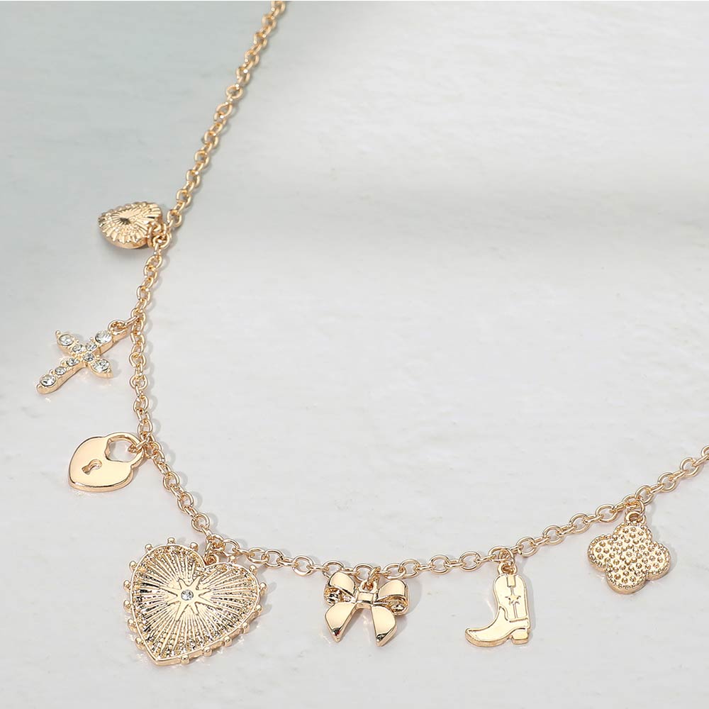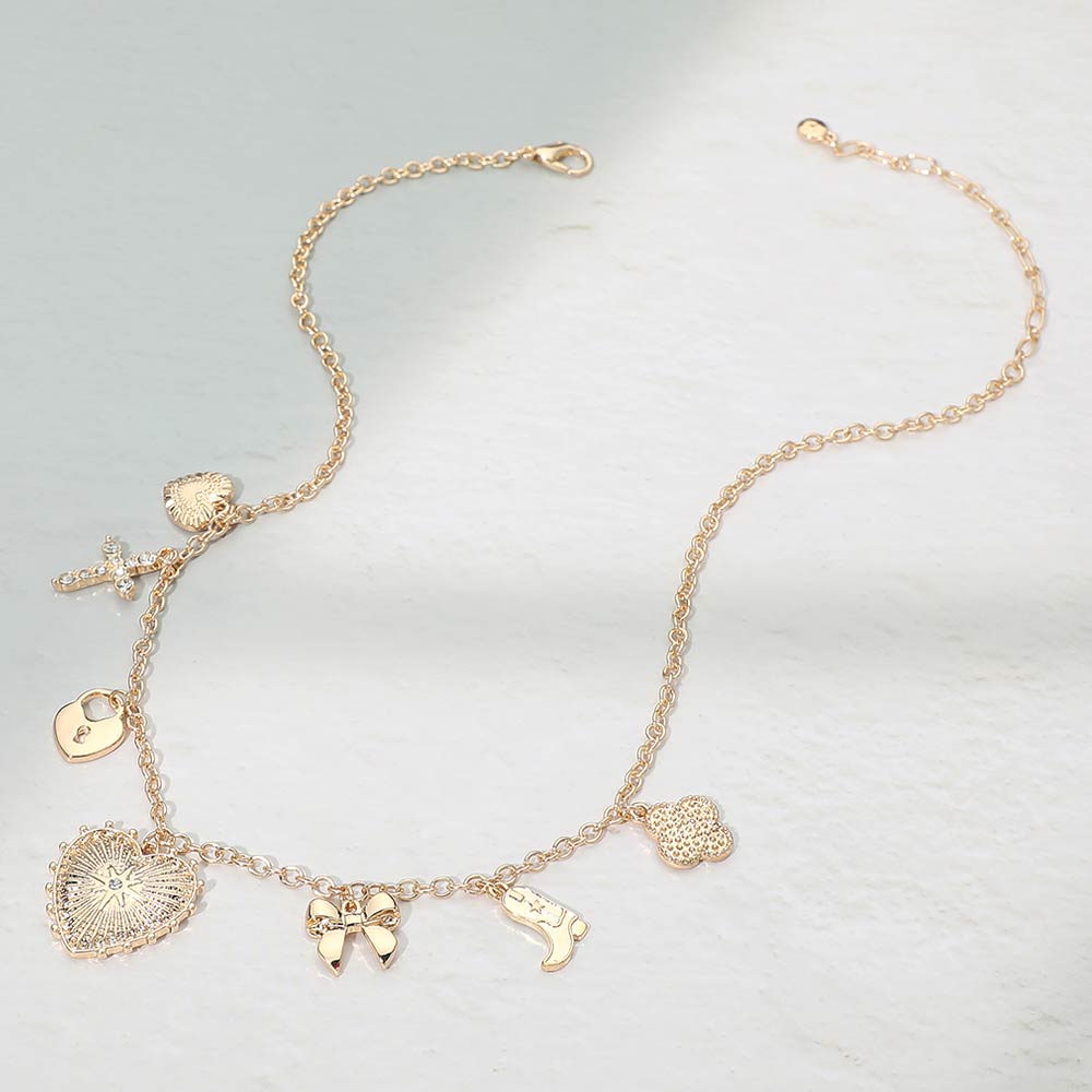 • Playful charm necklace featuring a delicate chain accented with multiple symbolic charms, including hearts, a bow, a cross, and western-inspired details. The layered charm design adds personality and movement, making it a standout piece for everyday wear or styling with other necklaces. Perfect for casual outfits, festival looks, and gift-giving, this necklace brings a mix of romance, fun, and statement style to any jewelry collection.