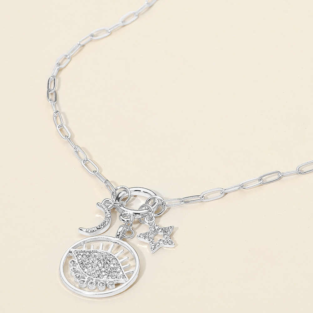 Details • Necklace Size : 17" + 2.5" L • Decor Size : 1.75" L • Add a touch of celestial elegance with this charm necklace featuring moon, star, and eye pendants adorned with sparkling stones. Perfect for layering or wearing solo, this piece blends modern style with symbolic beauty, making it ideal for both everyday wear and special occasions. • Lead and Nickel Compliant