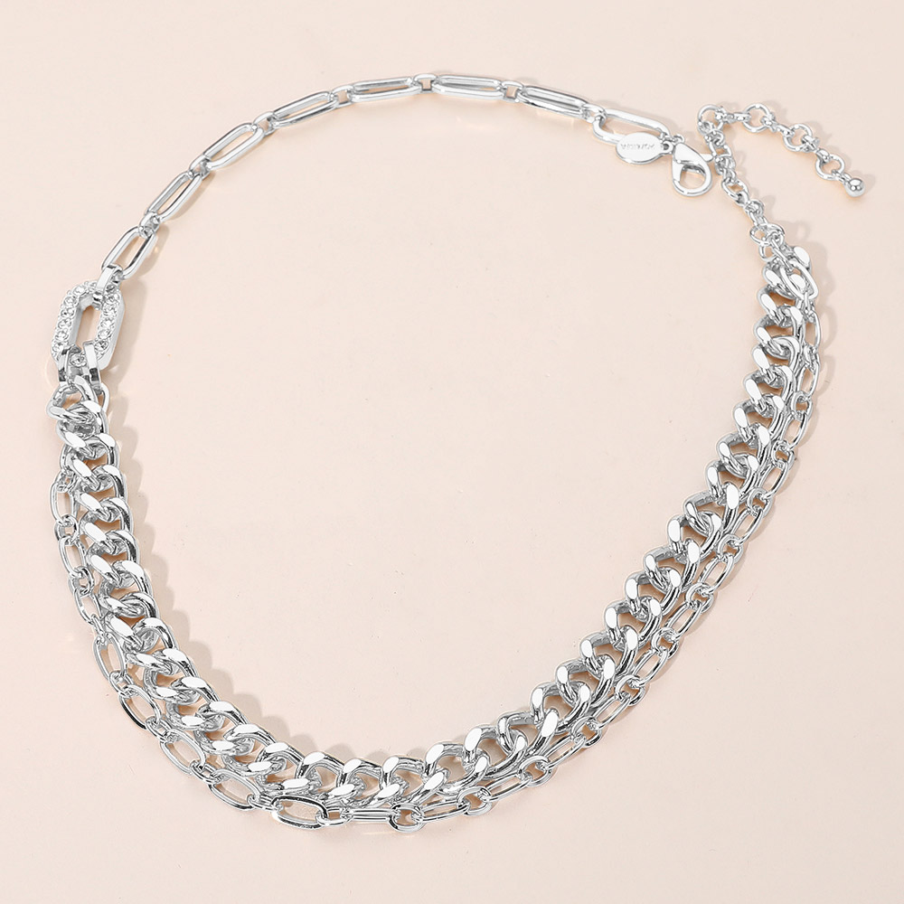 Details • Necklace Size : 19" + 3" L • Decor Size : 0.7" L • Stylish statement necklace combining bold curb and elongated link chains for a modern layered effect. Features an asymmetrical design with a touch of sparkle, perfect for elevating any outfit with contemporary sophistication and versatile everyday appeal. • Lead and Nickel Compliant