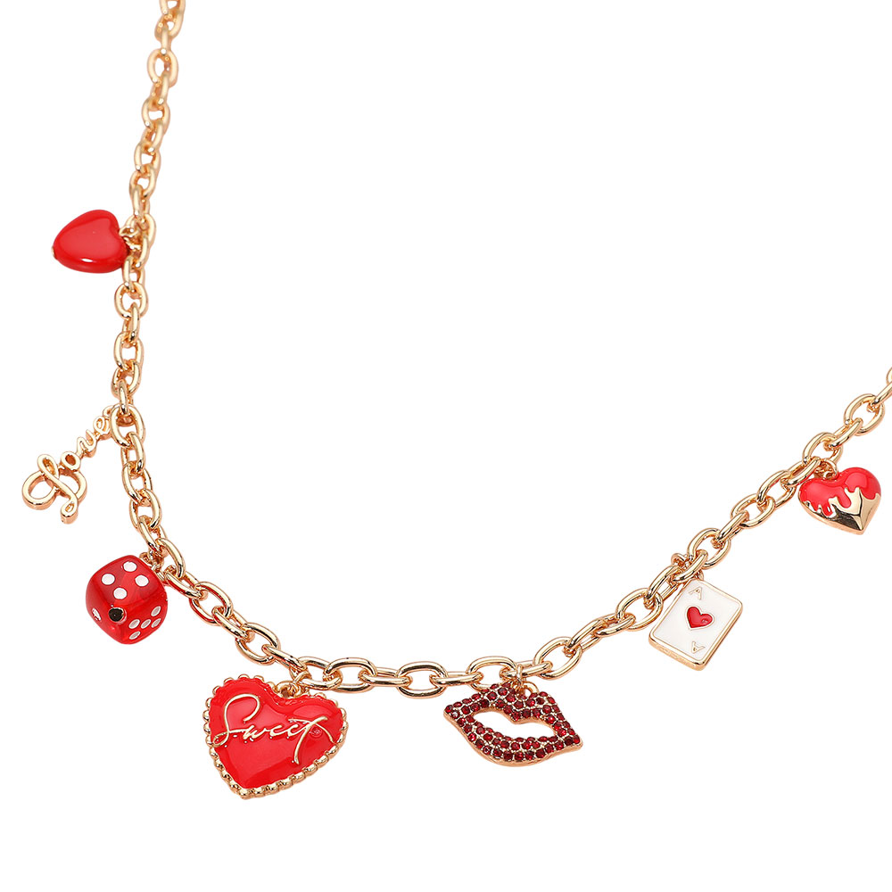 Details • Necklace Size : 16" + 3.5" L • Decor Size : 1.2" L • This sweetheart charm necklace brings fun and flair with its playful mix of heart, lips, dice, and card motifs. Designed on a delicate chain with bold enamel details, it adds a flirty, expressive touch to any outfit—perfect for gifting or making a personal fashion statement. • Lead and Nickel Compliant