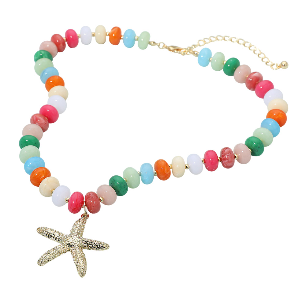 Details • Necklace Size : 18" + 4" L • Decor Size : 2" L • Playful beaded necklace featuring colorful round beads accented with a textured starfish pendant. A vibrant and stylish accessory perfect for beach outings, summer looks, or adding a fun coastal vibe to everyday wear. • Lead and Nickel Compliant
