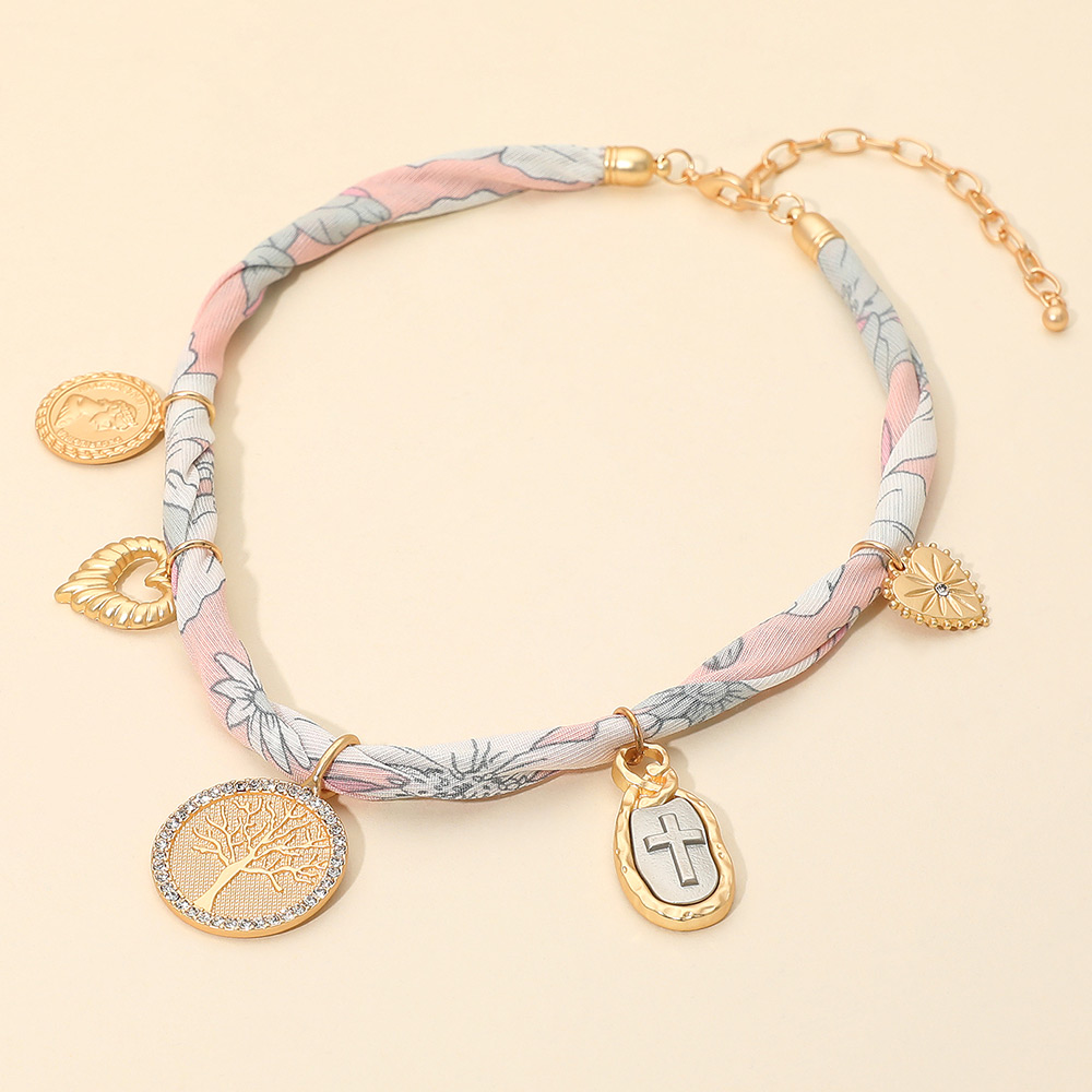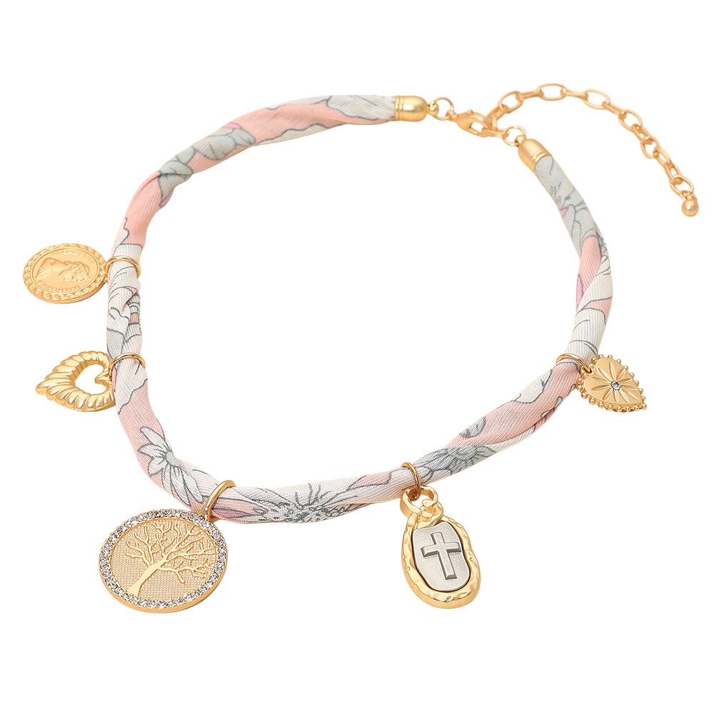 Details • Necklace Size : 14.5" + 3" L • Decor Size : 1" L • Print may vary • Enhance your style with this elegant fabric necklace adorned with assorted pendants, including symbolic charms and detailed accents. Its adjustable design offers comfort and versatility, making it a standout accessory for casual and special occasions alike. • Lead and Nickel Compliant