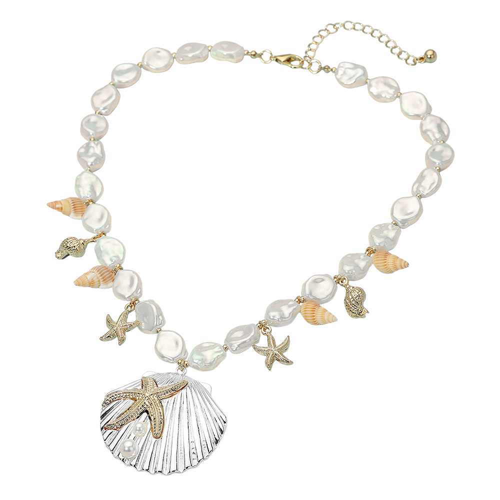 Details • Necklace Size : 18.5" + 3" L • Decor Size : 1.8" L • This seashell and starfish charm necklace celebrates the beauty of the ocean with detailed charms and elegant beaded accents. A statement piece that evokes coastal vibes, it’s perfect for adding a touch of seaside charm to any look, from casual to dressy. • Lead and Nickel Compliant