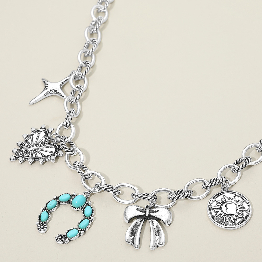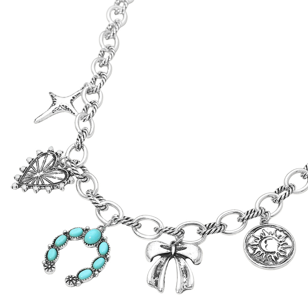 Vintage Bow Heart Turquoise Horseshoe Charm Station Textured Chain Necklace Vintage Bow Heart Turquoise Horseshoe Charm Station Textured Chain Necklace Vintage Bow Heart Turquoise Horseshoe Charm Station Textured Chain Necklace
