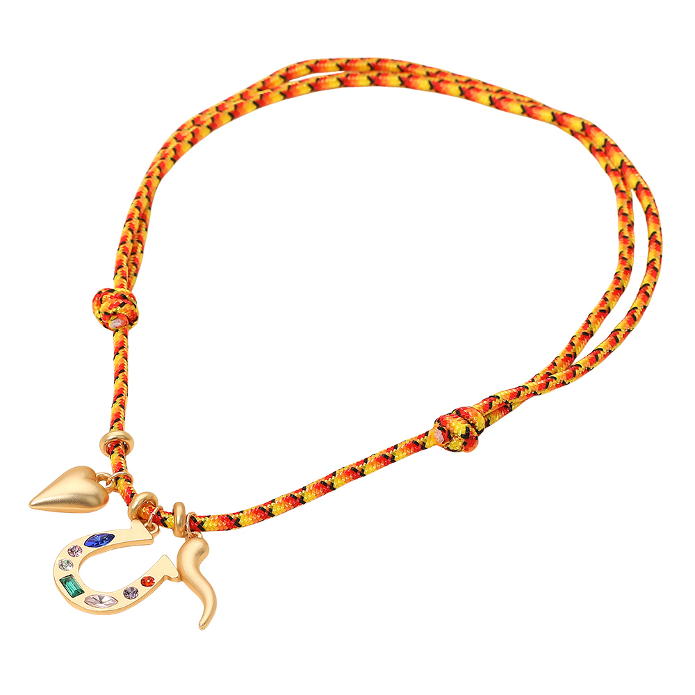 Details • Necklace Size : 27" L / Adjustable • Pendant Size : 1" L • This adjustable cord necklace features a trio of playful charms, including a heart, a curved symbol and a lucky horseshoe embellished with vibrant stones. Designed to add personality and a touch of fun, it brings a bold, expressive detail to everyday or festival-inspired looks. • Lead and Nickel Compliant