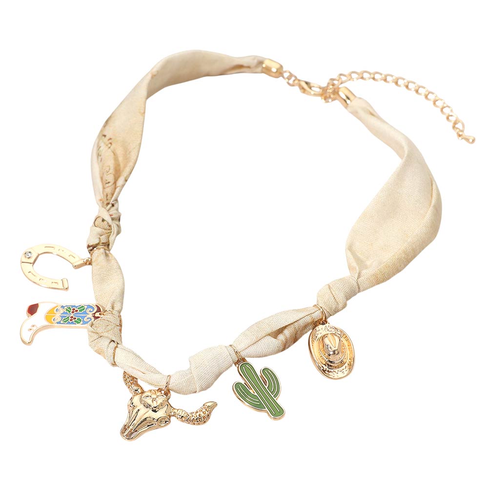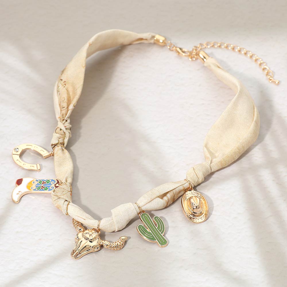Details • Necklace Size : 16.5" + 3.75" L • Decor Size : 1.1" L • This western charm scarf style bracelet features a knotted fabric band accented with playful symbolic charms for a bold yet effortless look. Designed to stand out in themed collections, it works well for festival styling, casual outfits, and statement accessory edits. A distinctive bracelet option for boutiques seeking novelty pieces with strong visual impact and trend appeal. • Lead and Nickel Compliant