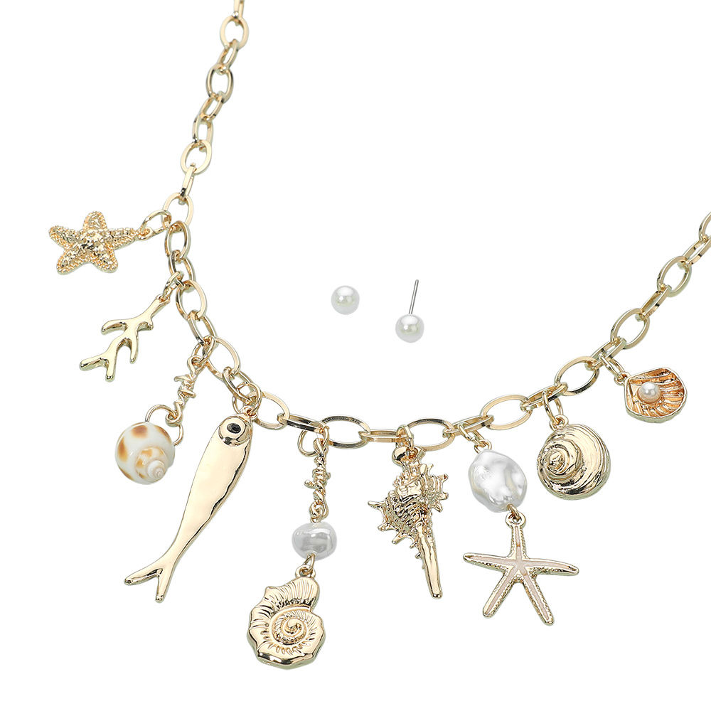Details • Necklace Size : 16.5" + 3.25" L • Decor Size : 2.1" L • Earrings Size : 0.2" L • Whimsical charm necklace and stud earring set featuring a mix of seaside-inspired motifs arranged along a linked chain for playful movement and layered appeal. Designed to add personality to everyday outfits, vacation looks, and casual styling, this set offers standout charm for boutique accessory collections. • Lead and Nickel Compliant