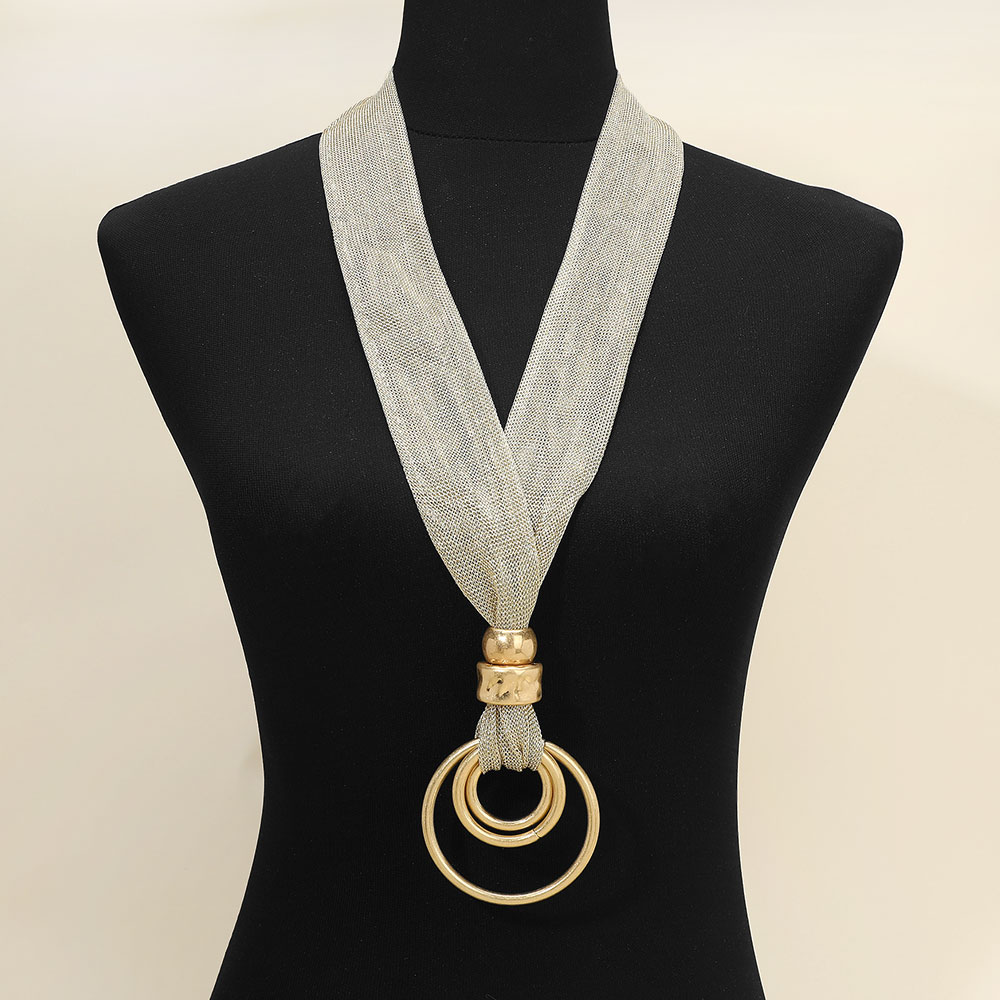 Details • Necklace Size : 35" + 3.25" L • Pendant Size : 2.75" X 4" • Modern statement necklace featuring a wide mesh-style band paired with layered circular pendant accents for a bold, contemporary look. Designed to drape elegantly at the neckline, this necklace elevates everyday outfits, workwear, and special occasions with sleek, fashion-forward appeal.