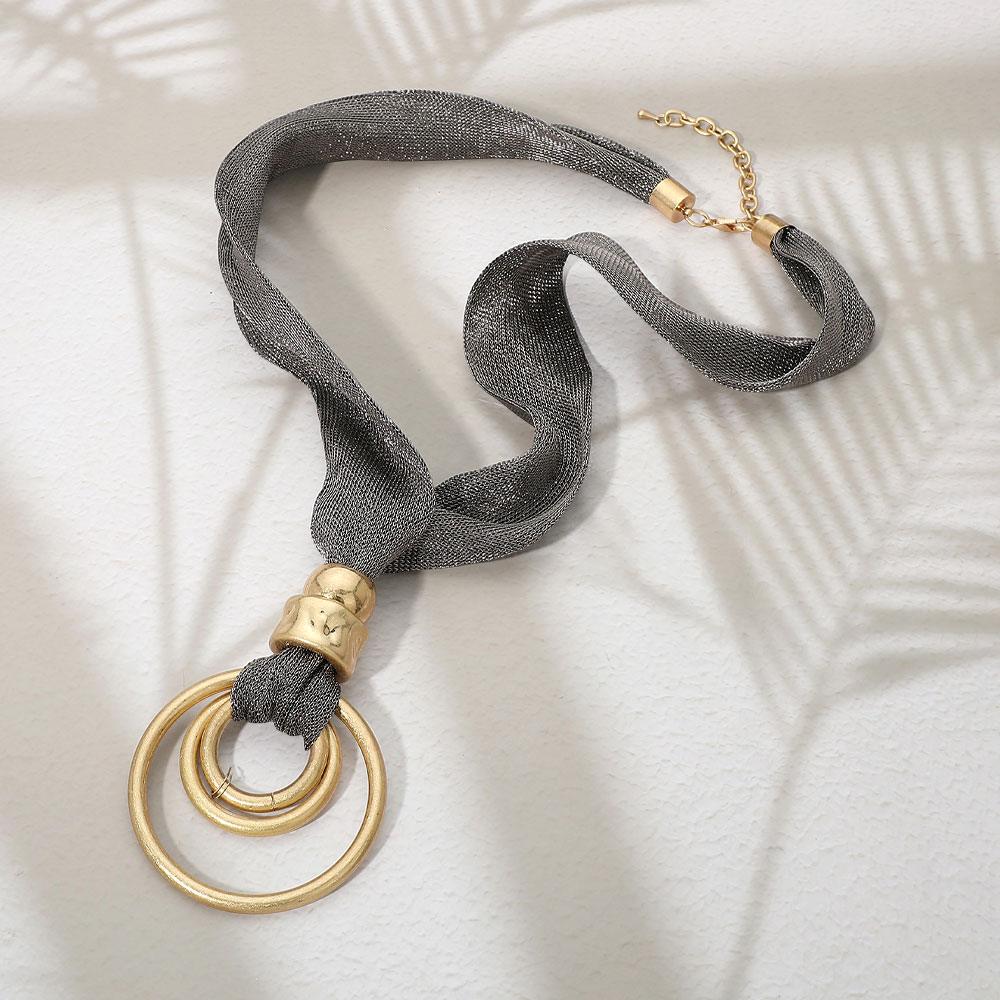 Details • Necklace Size : 35" + 3.25" L • Pendant Size : 2.75" X 4" • Modern statement necklace featuring a wide mesh-style band paired with layered circular pendant accents for a bold, contemporary look. Designed to drape elegantly at the neckline, this necklace elevates everyday outfits, workwear, and special occasions with sleek, fashion-forward appeal.