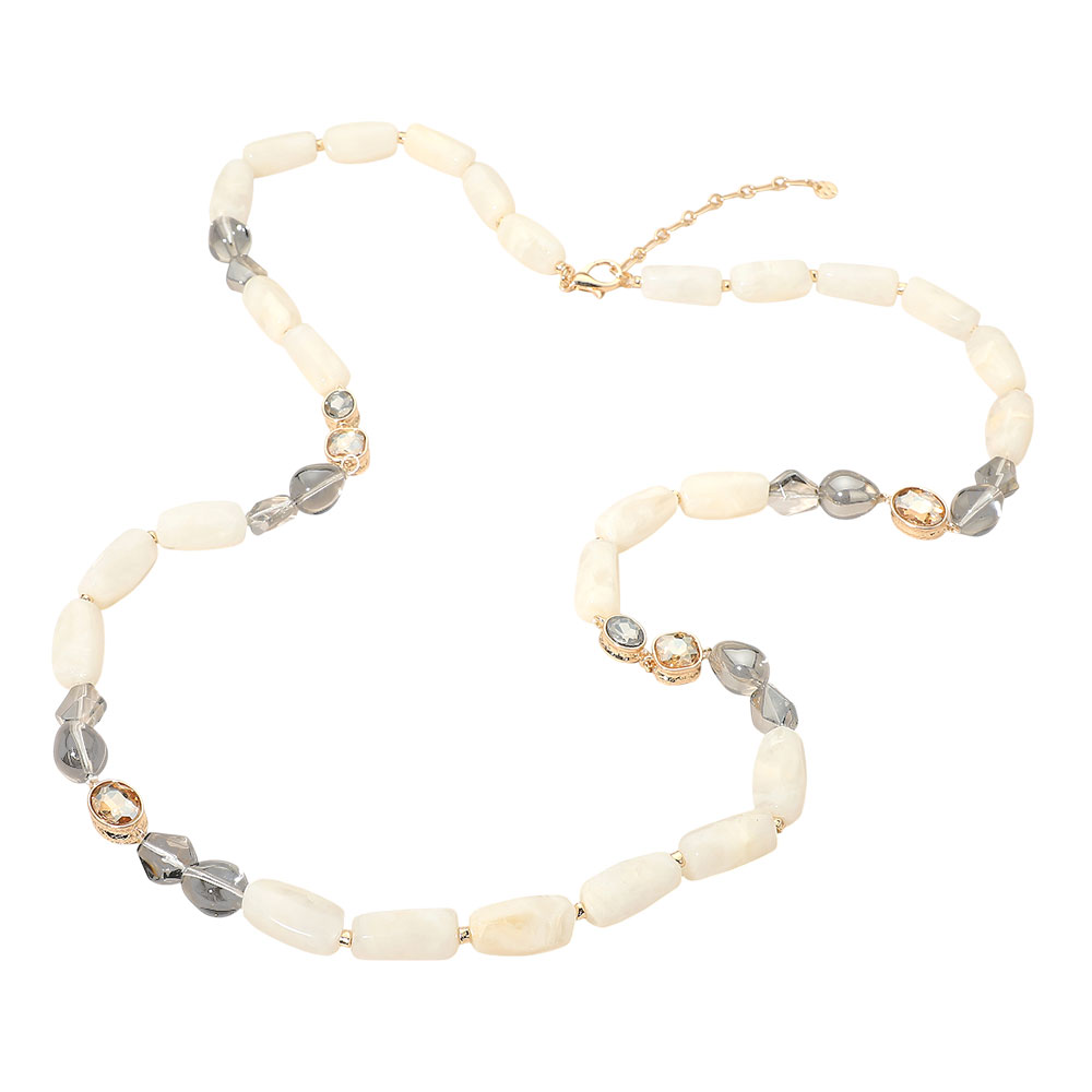 • This long beaded statement necklace features a balanced mix of elongated beads and decorative accents for a refined, eye-catching look. Designed to elevate both casual and polished outfits, it adds texture, movement, and visual interest, making it a versatile choice for boutique and fashion-forward jewelry assortments.