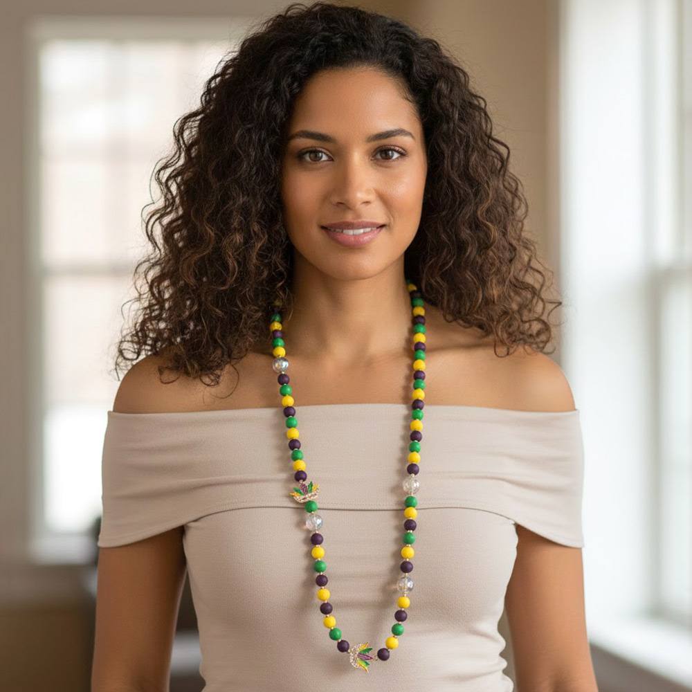 Details • Necklace Size : 34" + 3.25" L • Decor Size : 1" L • Statement Mardi Gras–inspired necklace designed with smooth round beads, luminous accent beads, and decorative charm details spaced throughout the strand. Finished with an adjustable chain for comfortable wear. Ideal for parade outfits, themed events, party styling, and festive boutique displays. A versatile accessory that adds playful character and celebration-ready appeal. • Lead and Nickel Compliant