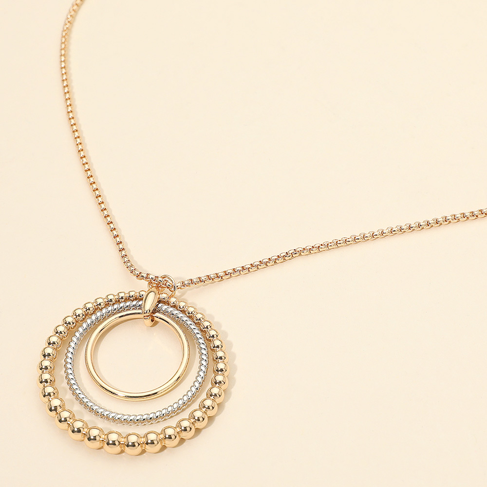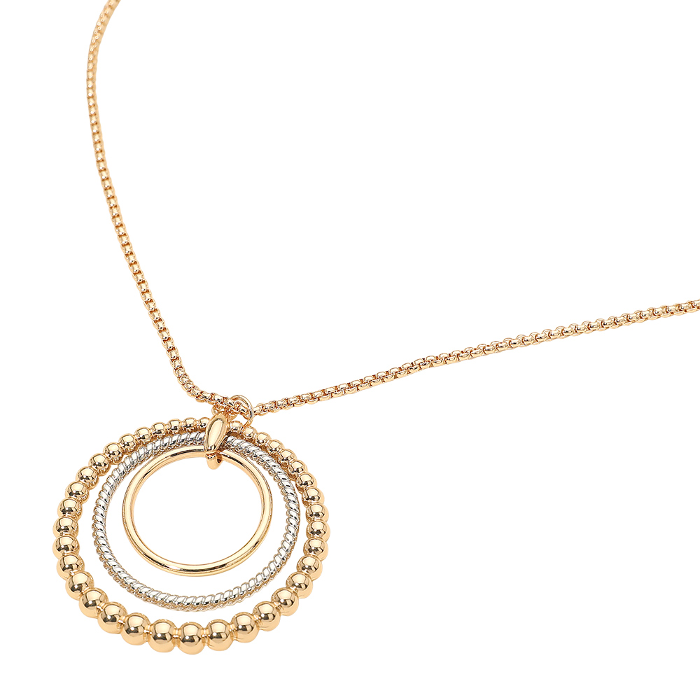 Details • Necklace Size : 34.5" + 3.5" L • Pendant Size : 1.7" X 1.75" • Features layered circular pendants with contrasting textures on a sleek chain for a modern, eye-catching look. Designed to add subtle movement and standout style to everyday outfits or dressier ensembles. • Lead and Nickel Compliant