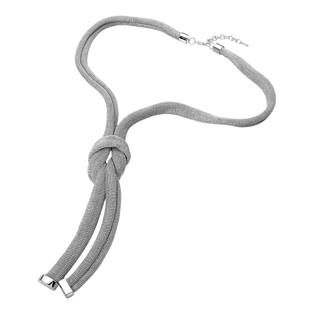 Details • Necklace Size : 33" + 3.25" L • Decor Size : 8" L • Sleek statement necklace featuring a soft, flexible silhouette with a sculptural knot detail for modern elegance. Designed to drape smoothly and add visual interest, this necklace enhances everyday outfits, workwear, and special occasions with refined, fashion-forward appeal. • Lead and Nickel Compliant