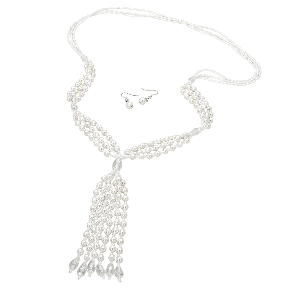• This beaded necklace set features a layered strand design with an elegant tassel drop centerpiece and matching dangle earrings. Created to make a statement, it’s ideal for evening wear, special events, or elevated everyday styling. A bold yet versatile accessory set perfect for boutiques seeking dramatic silhouette, movement, and refined detail in curated jewelry collections.