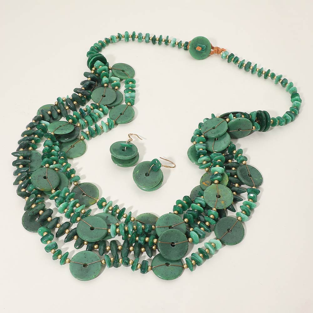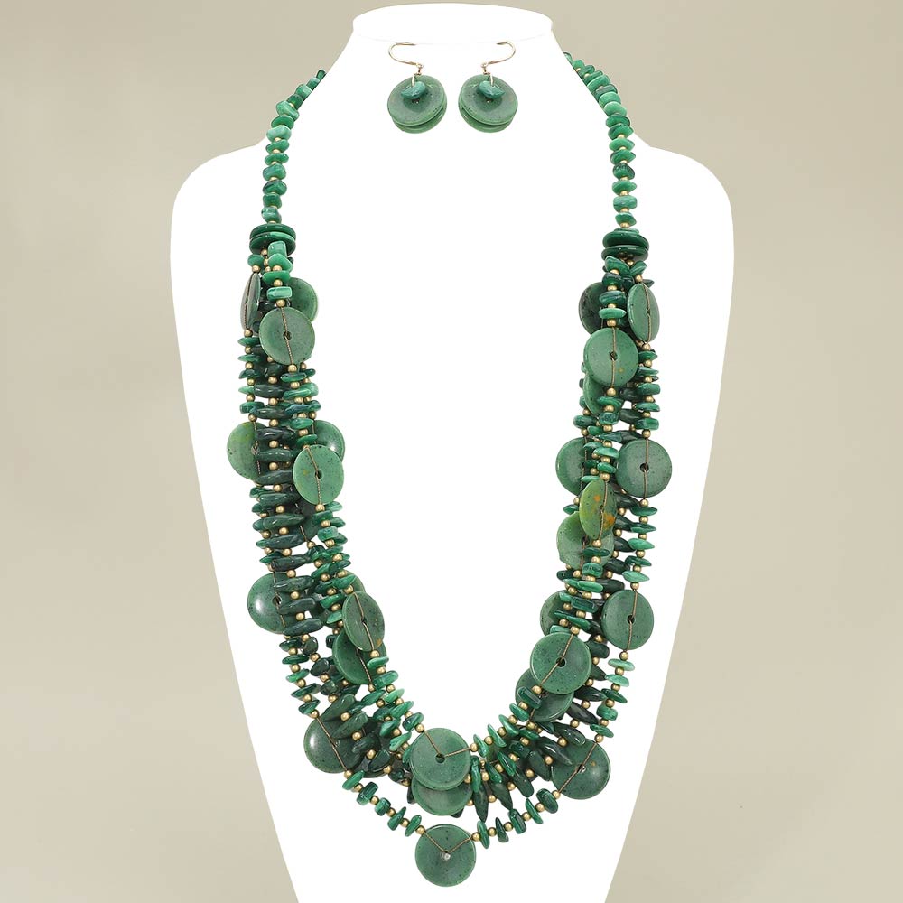 Details • Necklace Size : 32" + 1" L • Decor Size : 2.75" L • Earrings Size : 1.8" L • This layered disc statement necklace set features cascading round accents paired with textured detailing and matching earrings for a bold yet organic look. Designed to elevate boutique collections, it offers strong visual movement and dimension, making it ideal for statement styling, resort-inspired outfits, special occasions, and fashion-forward everyday wear. • Lead and Nickel Compliant