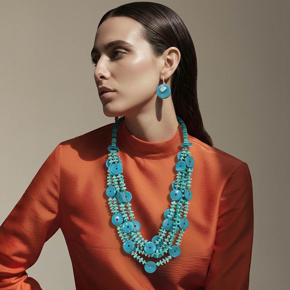 • This layered disc statement necklace set features cascading round accents paired with textured detailing and matching earrings for a bold yet organic look. Designed to elevate boutique collections, it offers strong visual movement and dimension, making it ideal for statement styling, resort-inspired outfits, special occasions, and fashion-forward everyday wear.