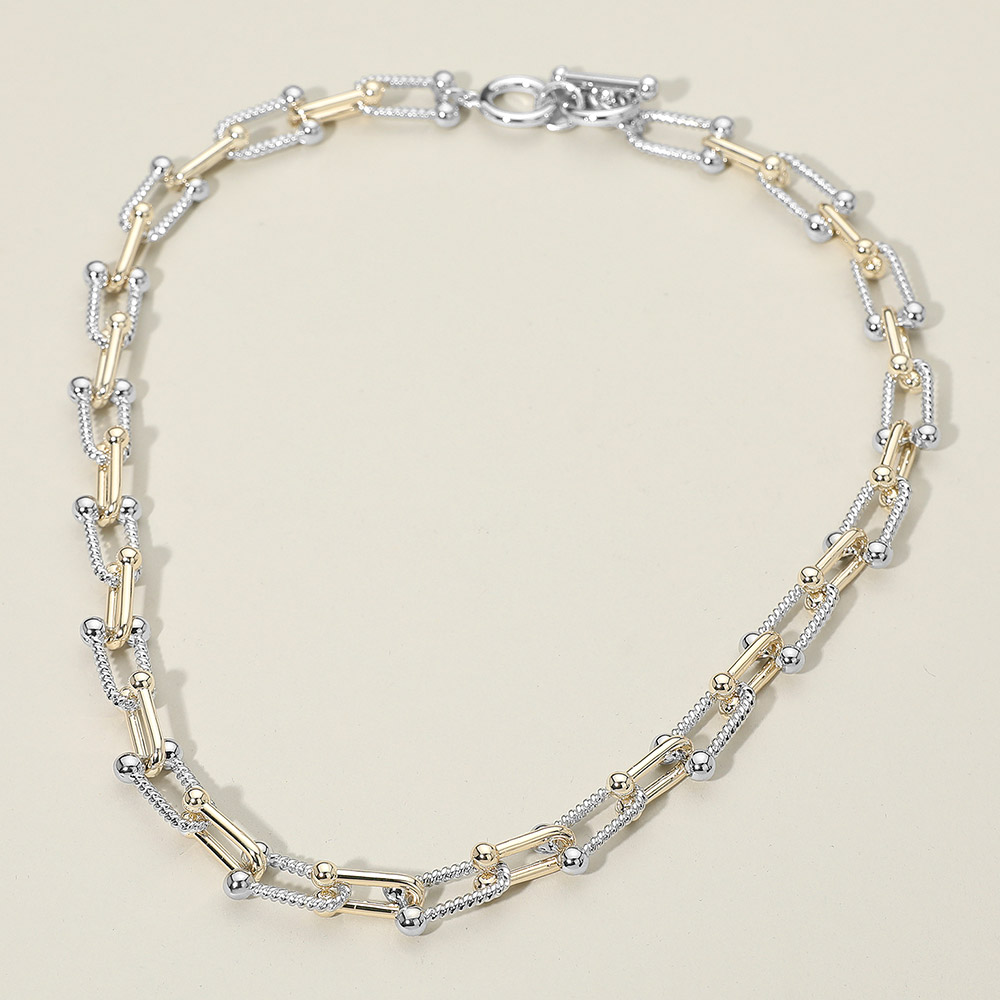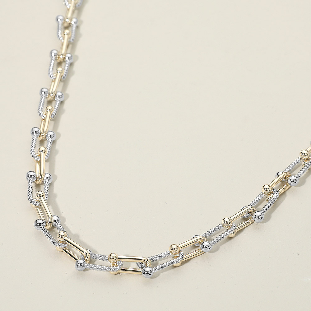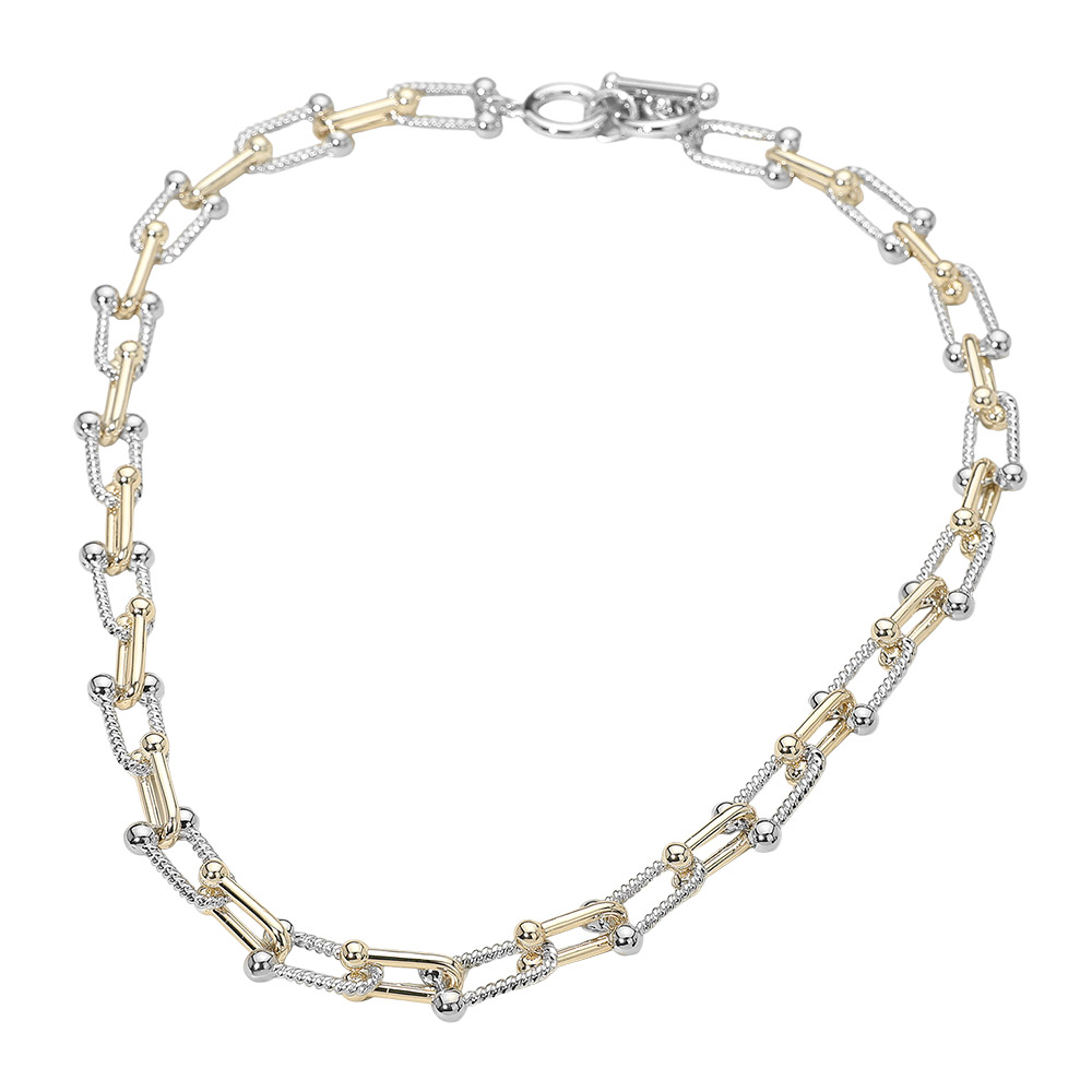 Details • Necklace Size : 16.5" + 1" L • Decor Size : 0.4" L • A refined linked chain necklace designed with intricate dual-tone detailing for a standout look. Its layered connectors and polished accents create a modern, elevated style that pairs effortlessly with everyday outfits or special occasions. A versatile accessory with timeless appeal. • Gold Dipped