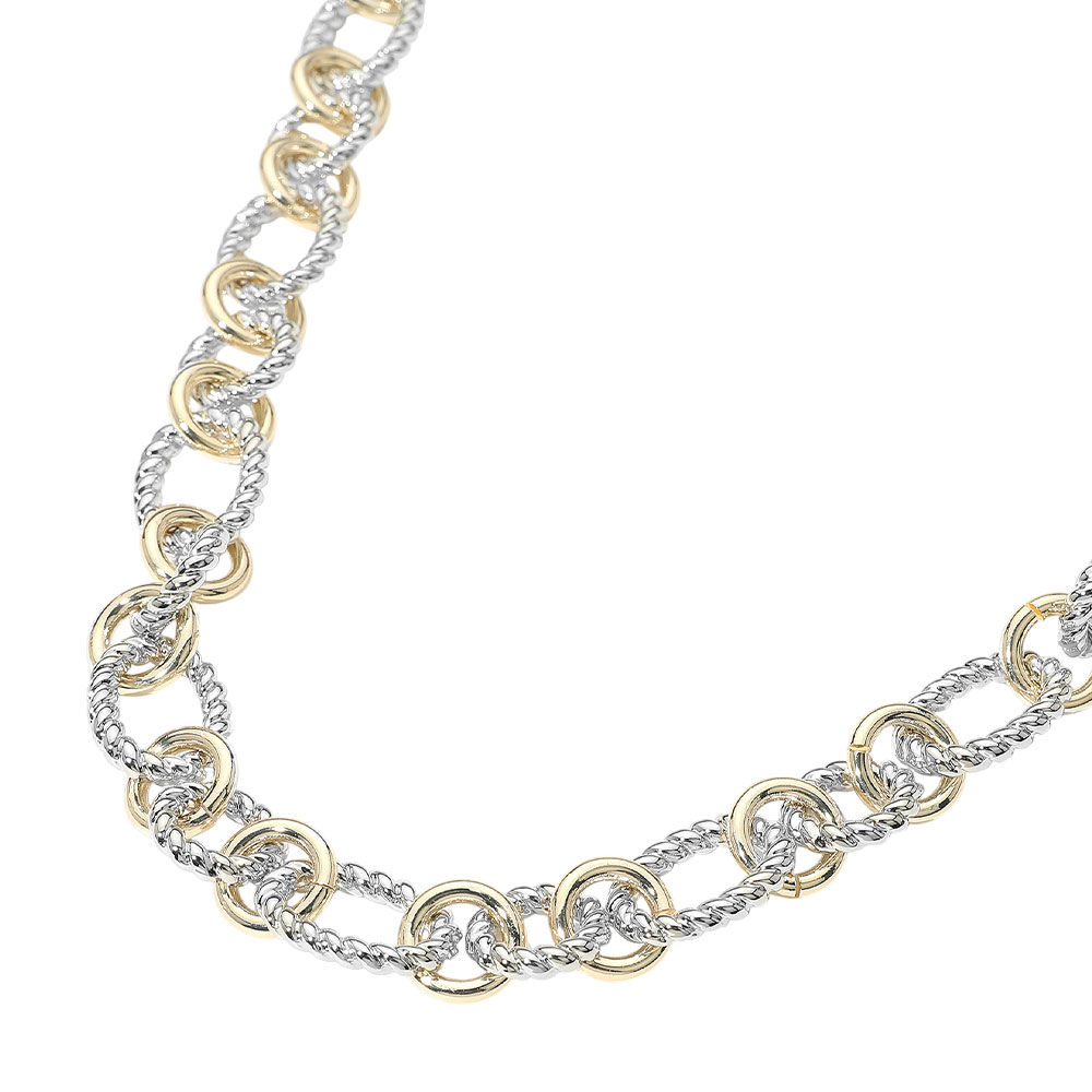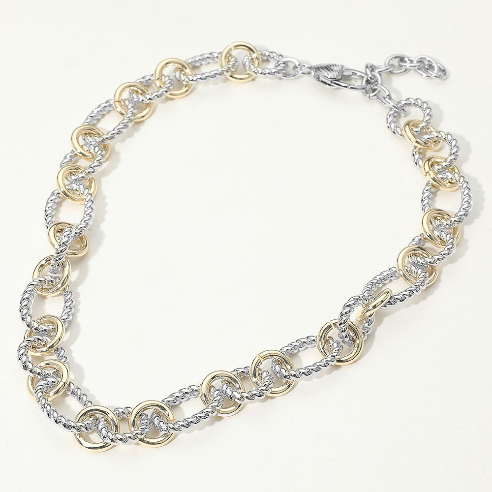 Details • Necklace Size : 16.5" + 2" L • Decor Size : 0.6" L • Chic and timeless, this twisted link chain necklace features alternating round accents in a sophisticated interlocking design. Perfect for layering or standalone elegance, it adds modern charm to any outfit. • Gold Dipped