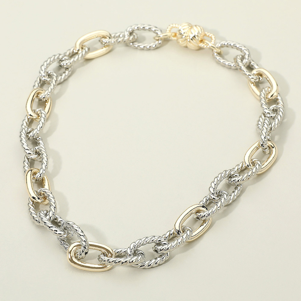 Details • Necklace Size : 16.75" L • Decor Size : 0.5" L • Magnetic Closure • A striking necklace featuring rope-textured oval links paired with smooth polished connectors for a bold two-tone effect. This chain design blends classic rope details with modern accents, perfect for layering or wearing solo as a statement piece. • Gold Dipped