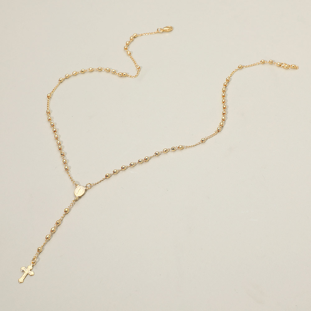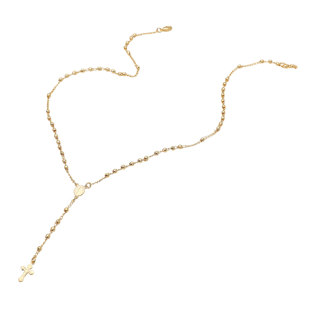Details • Necklace Size : 18" L • Decor Size : 2.75" L • Elegant rosary-inspired necklace featuring a delicate beaded chain and a refined cross pendant. This timeless design offers spiritual charm and modern sophistication, perfect for layering or wearing alone as a meaningful statement accessory for any occasion. • Gold Filled • Lead and Nickel Compliant • Made In Brazil