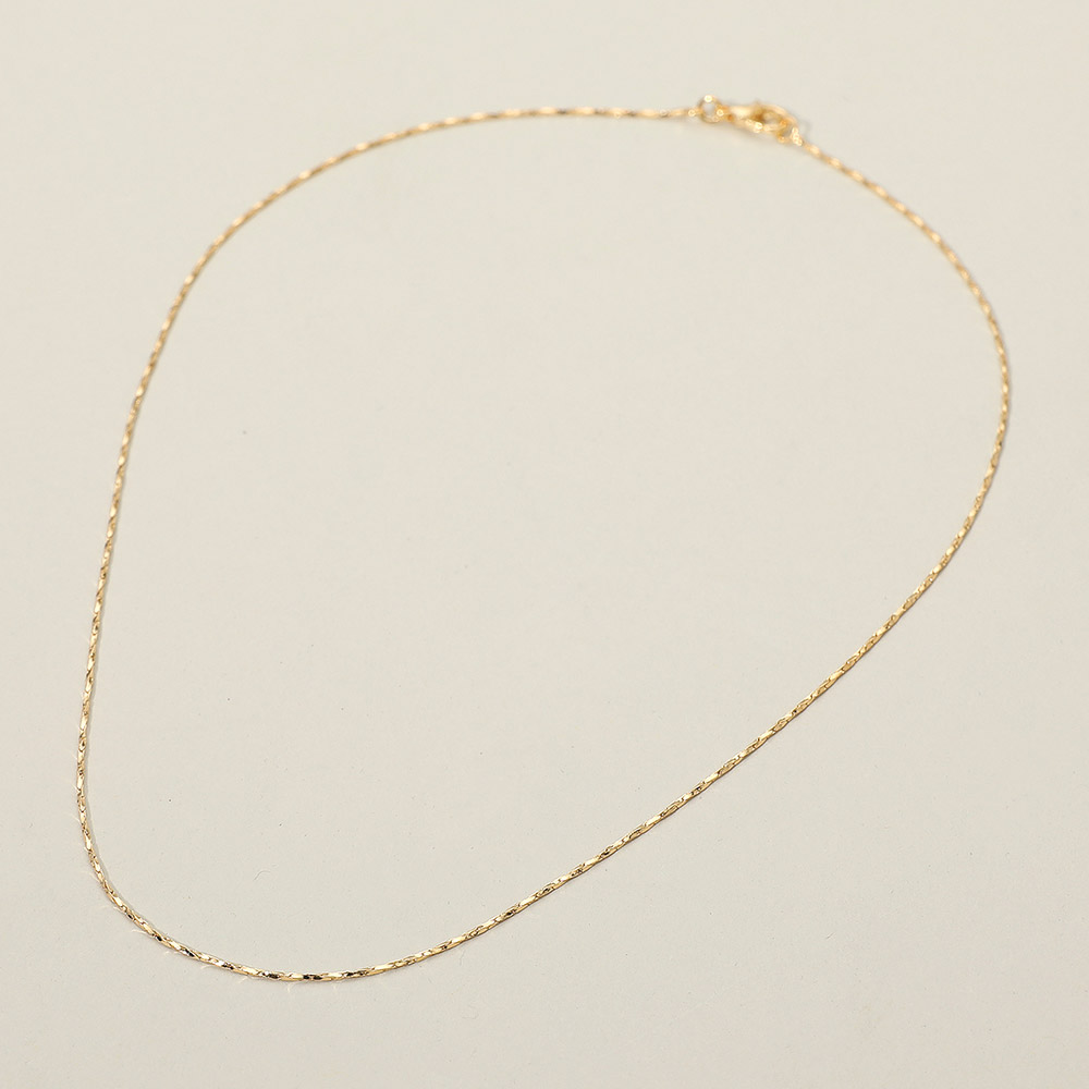 Details • Necklace Size : 16" L • Decor Size : 0.1" L (1mm) • Delicate twist chain necklace featuring a finely textured design that catches the light with every movement. Perfect for layering or wearing solo, this elegant piece adds a refined shimmer to casual and dressy looks alike. • Lead and Nickel Compliant • Gold Filled • Made In Brazil