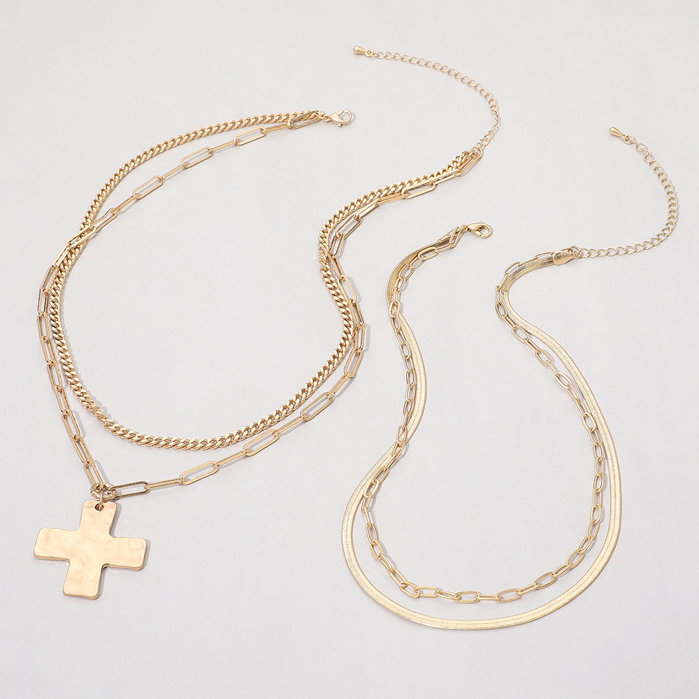 Details • Necklace 1 Size : 14.25" + 3.25" L, 0.5" L • Necklace 2 Size : 16" + 3" L, 1" L • Pendant Size : 1.25" X 1.25" • Fashion-forward layered necklace set featuring mixed chain styles and a bold cross pendant detail. Designed for adjustable length, comfortable wear, and effortless layering to elevate everyday outfits or add impact to special occasion looks. Perfect for gifting or personal styling. • Lead and Nickel Compliant
