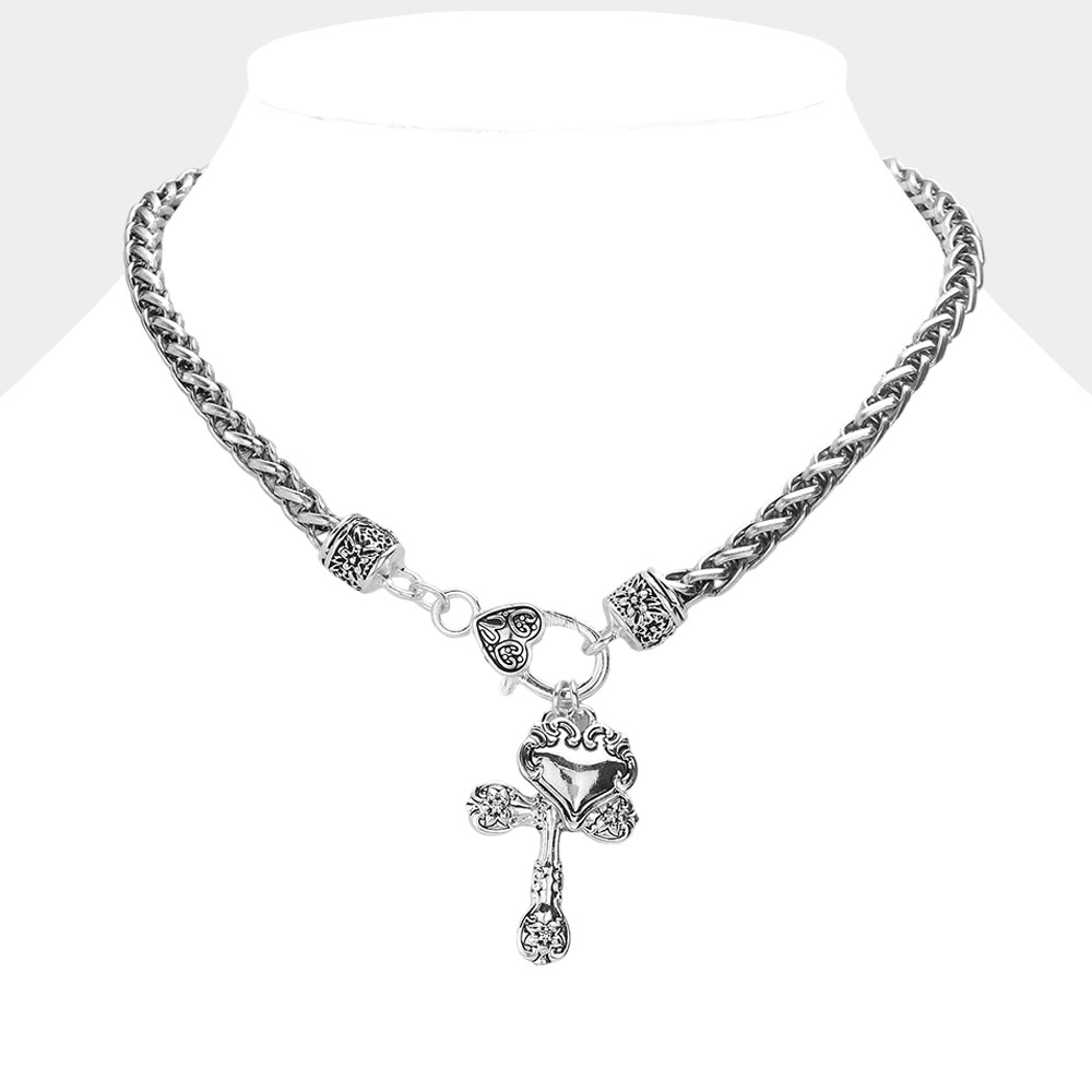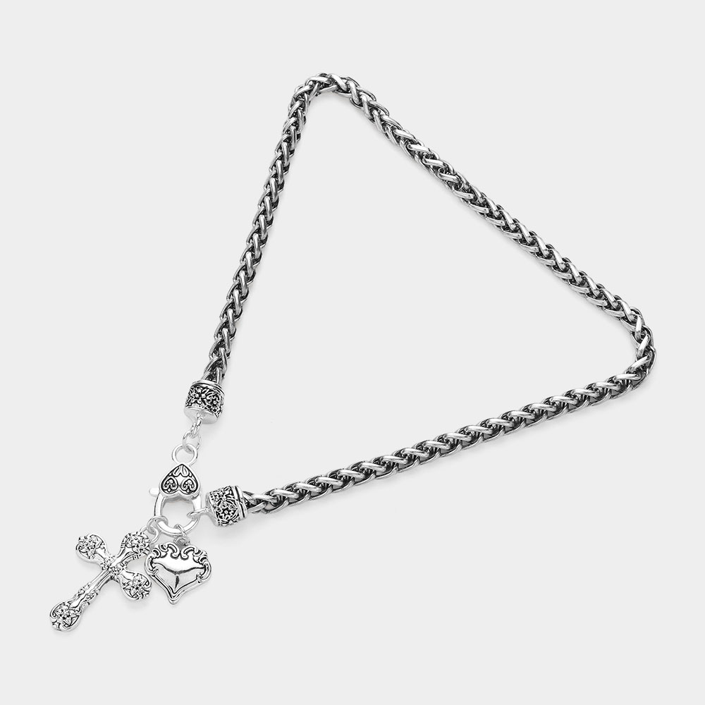 Heart Bow Pearl Quatrefoil Cross Charm Station Paperclip Chain Necklace