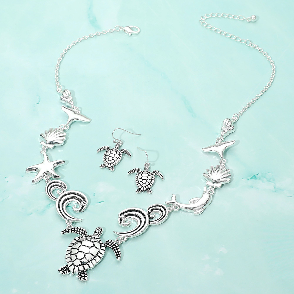 Details • Necklace Size : 18" + 3.25" L • Decor Size : 1.5" L • Earrings Size : 1.25" L • Sea turtle wave jewelry set featuring coordinated ocean-inspired designs that capture movement, balance, and coastal charm. A versatile statement collection ideal for everyday styling, gifting, or resort-inspired looks. Perfect for boutique assortments focused on marine, beach, and nature-themed fashion jewelry. • Lead and Nickel Compliant