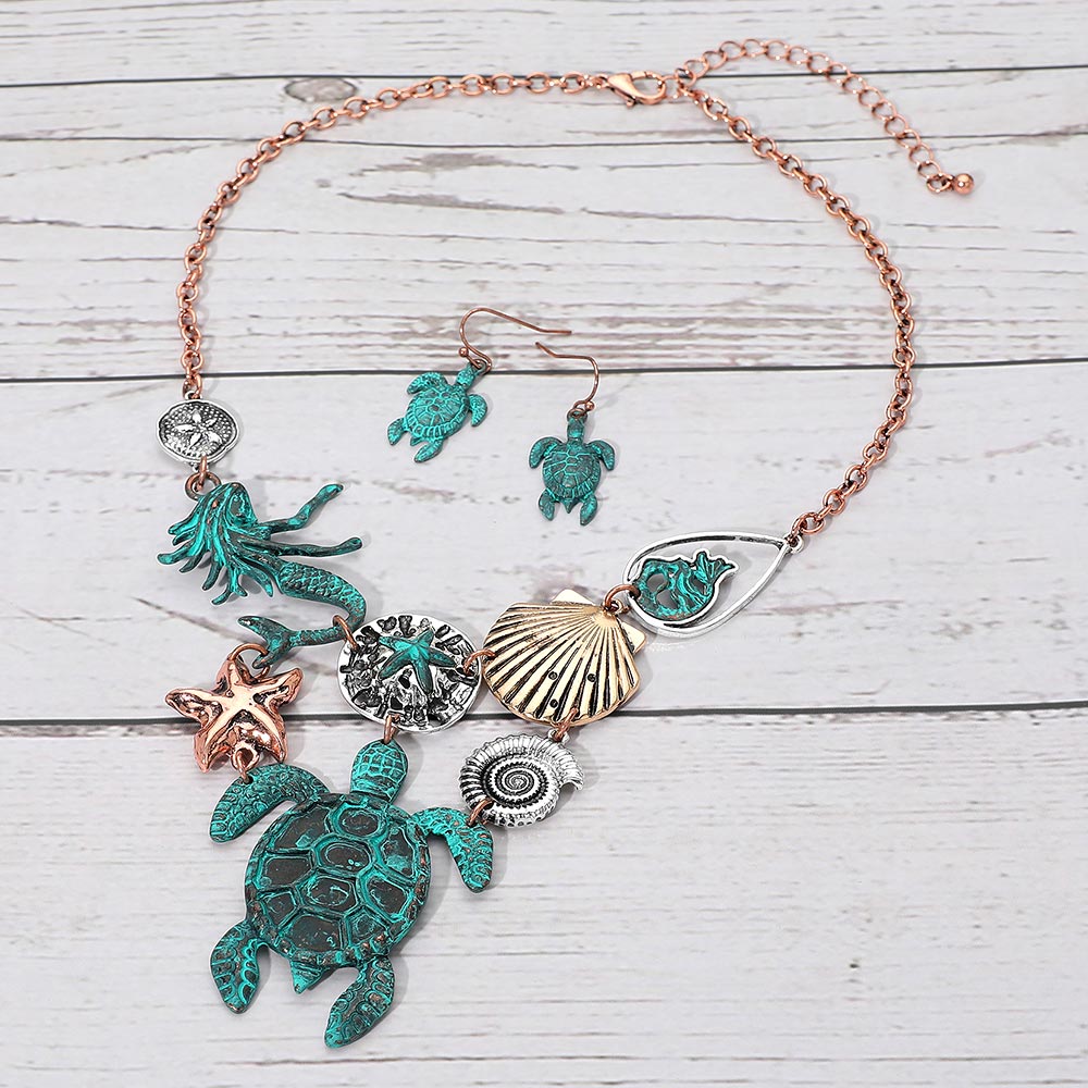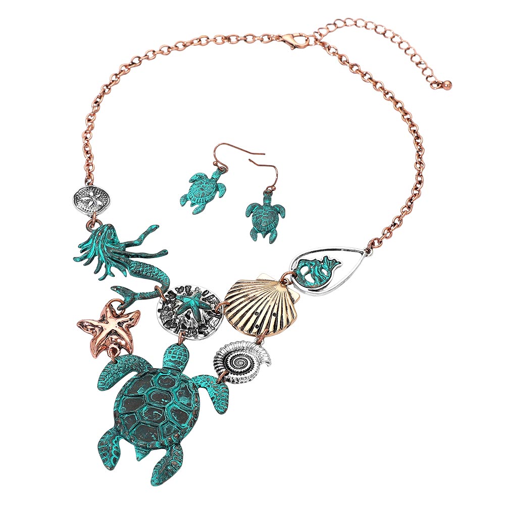 • Celebrate coastal elegance with this ocean-inspired necklace and earrings set featuring detailed sea-life charms. A standout turtle centerpiece pairs with mermaid, starfish, shell and spiral accents, offering a whimsical beach-themed accessory perfect for vacations, gifting or everyday style.