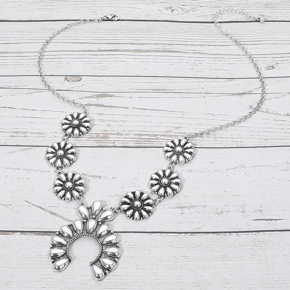 Details • Necklace Size : 22" + 3" L • Decor Size : 0.9" L • Pendant Size : 1.9" X 2.25" • Statement necklace featuring a cascading floral design that leads to a bold crescent charm centerpiece. Crafted to create visual impact with intricate detailing and balanced movement, this necklace is ideal for boho, western-inspired, festival, or boutique jewelry collections seeking an eye-catching focal piece. • Lead and Nickel Compliant