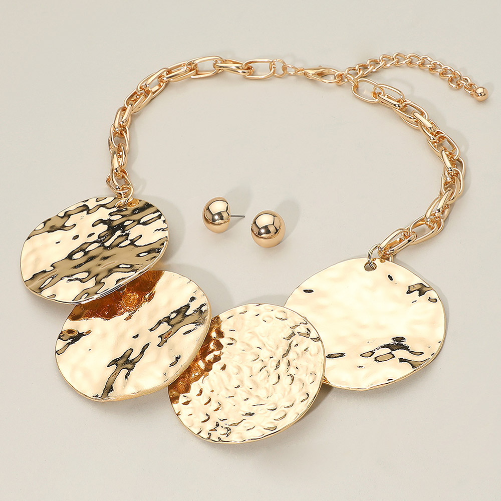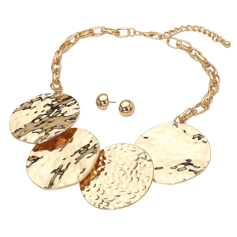 • Stand out with this hammered disc necklace and matching stud earring set designed to deliver bold texture and modern shine. Featuring layered circular pendants and an adjustable chain, it’s ideal for elevating everyday outfits or enhancing evening looks with confident, contemporary style and coordinated elegance.