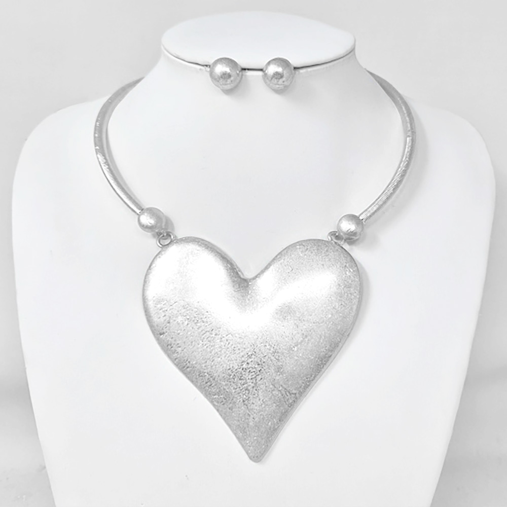 Details • Necklace Size : 14.5" + 3" L • Decor Size : 3.75" X 3.75" • Earrings Size : 0.6" L • Make a bold romantic statement with this oversized heart pendant necklace paired with simple stud earrings. Ideal for standout fashion moments, special occasions, or unique everyday style, this set adds a striking artistic touch that highlights your look with confident, eye-catching charm. • Lead and Nickel Compliant