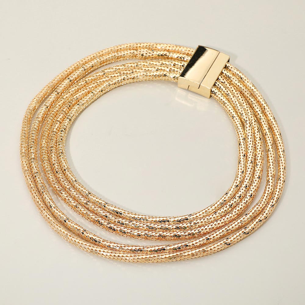 • Layered multi-strand textured chain necklace featuring shimmering woven strands and a sleek magnetic clasp. A bold yet versatile statement piece perfect for elevating casual or dressy outfits with a modern, polished finish.