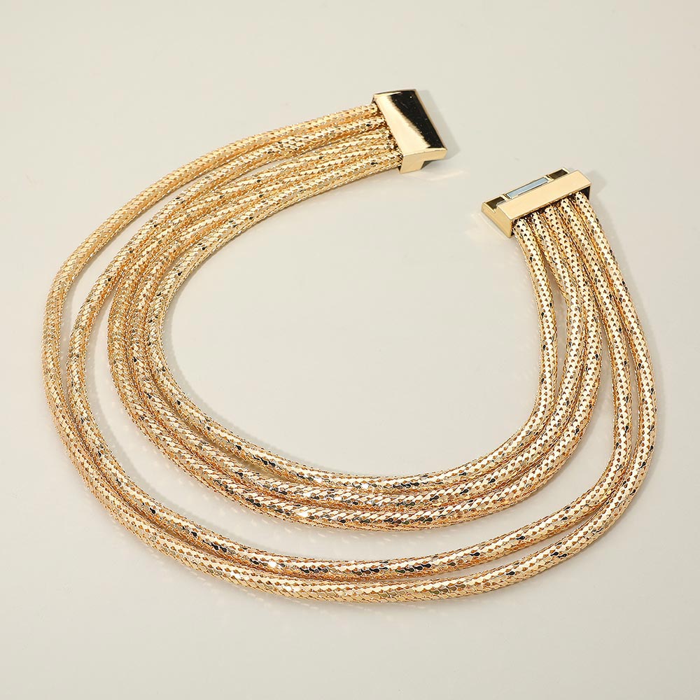 Details • Necklace Size : 20" L • Decor Size : 3.5" L • Magnetic Closure • Layered multi-strand textured chain necklace featuring shimmering woven strands and a sleek magnetic clasp. A bold yet versatile statement piece perfect for elevating casual or dressy outfits with a modern, polished finish. • Lead and Nickel Compliant